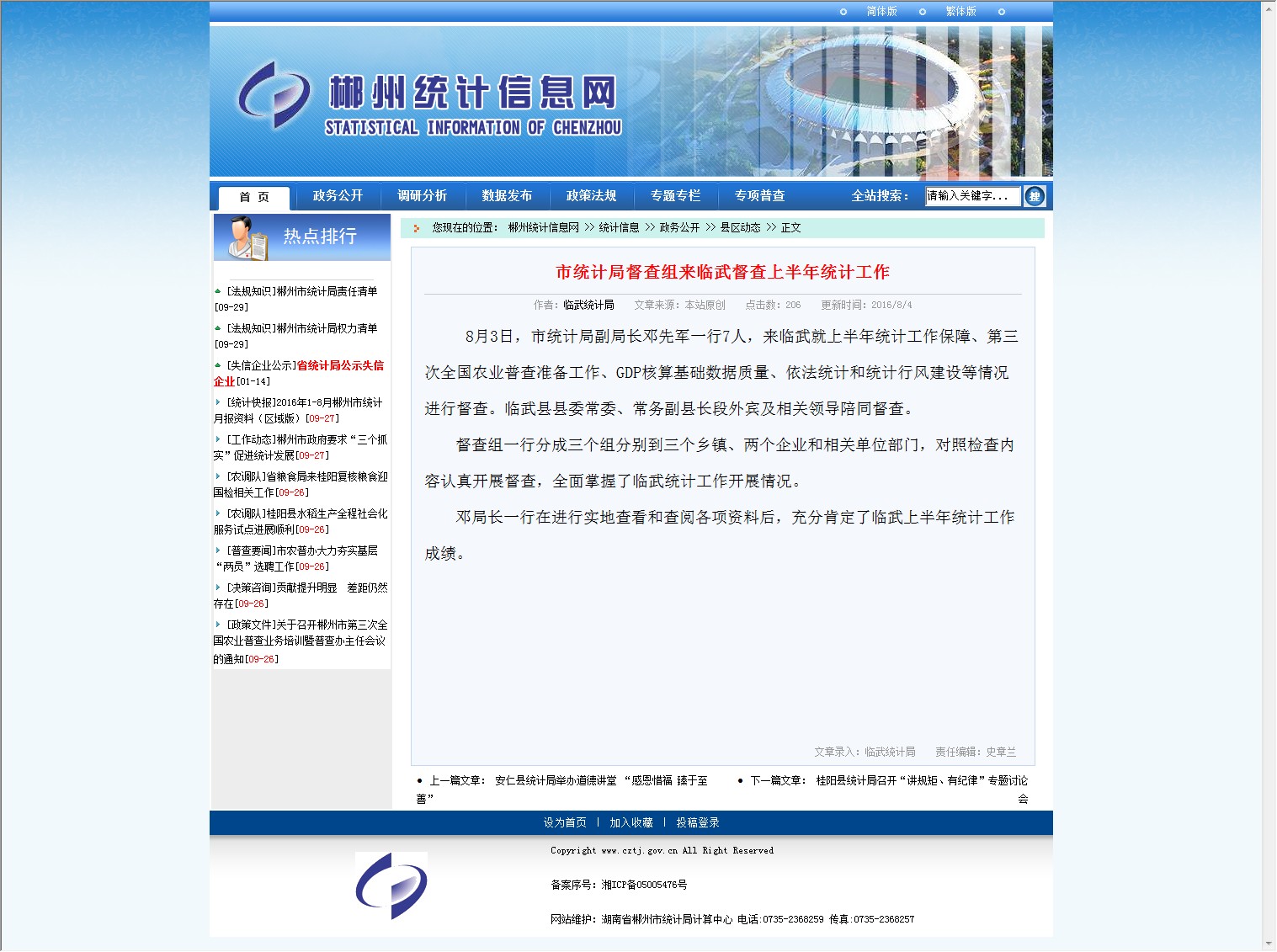 8月3日,市统计局副局长邓先军一行7人,来临武就上半年统计工作保障、第三次全国农业普查准备工作、GDP核算基础数据质量、依法统计和统计行风建设等情况进行督查。临武县县委常委、常务副县长段外宾及相关领导陪同督查。