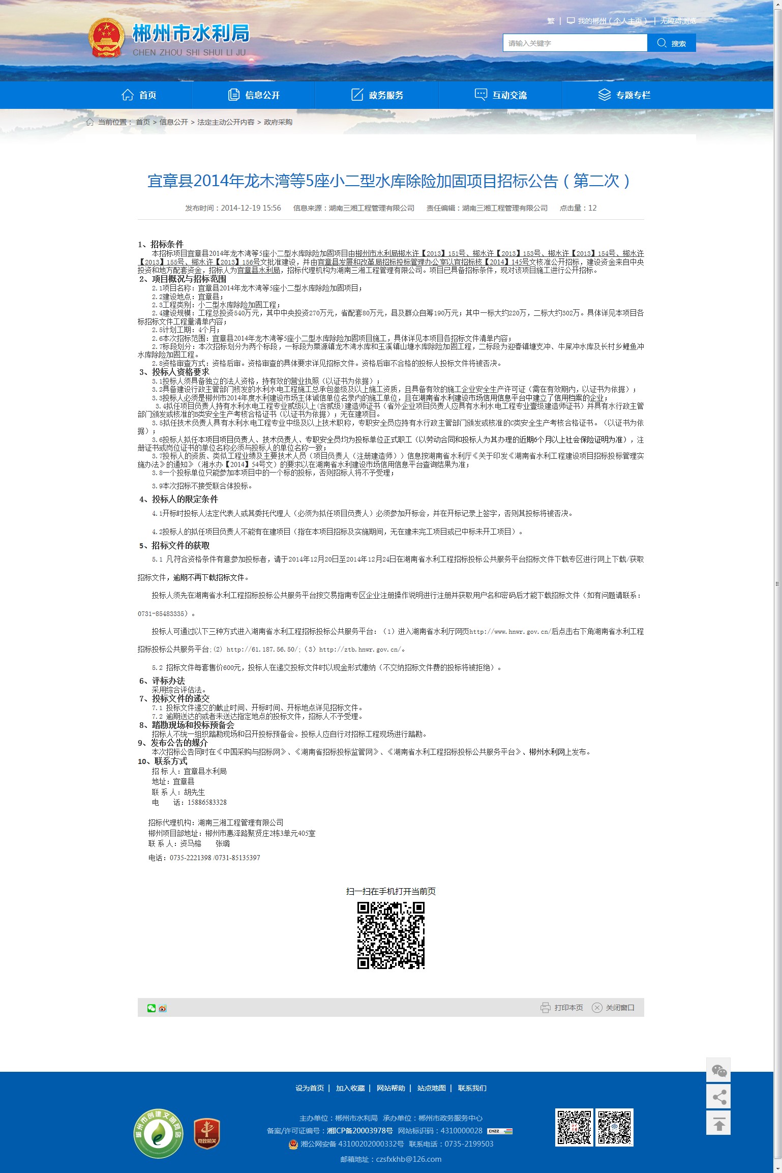 本次招标公告同时在《中国采购与招标网》、《湖南省招标投标监管网》、《湖南省水利工程招标投标公共服务平台》、郴州水利网上发布。