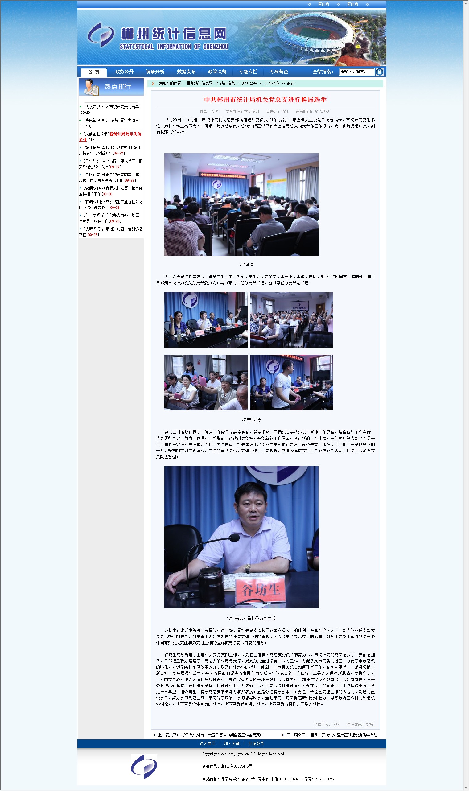 大会以无记名投票方式,选举产生了由邓先军、雷银菊、陈冬文、李建平、李娟、曾艳、胡平金7位同志组成的新一届中共郴州市统计局机关总支部委员会。其中邓先军任总支部书记,雷银菊任总支部副书记。