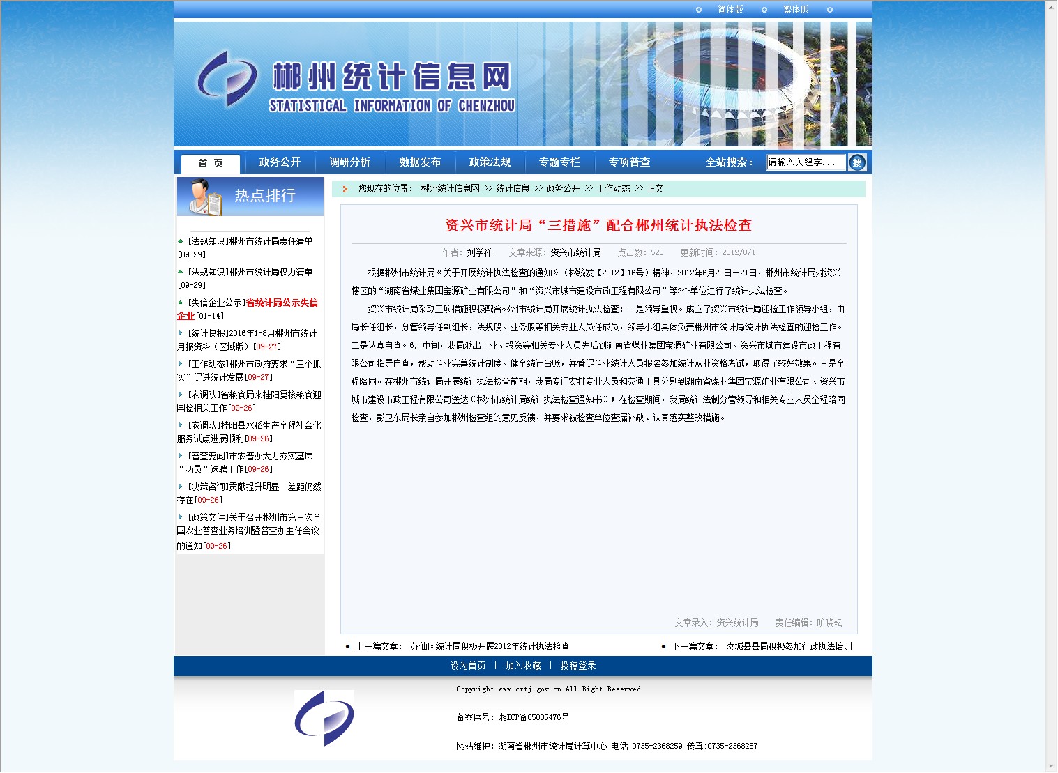 根据郴州市统计局《关于开展统计执法检查的通知》(郴统发【2012】16号)精神,2012年6月20日—21日,郴州市统计局对资兴辖区的“湖南省煤业集团宝源矿业有限公司”和“资兴市城市建设市政工程有限公司”等2个单位进行了统计执法检查。