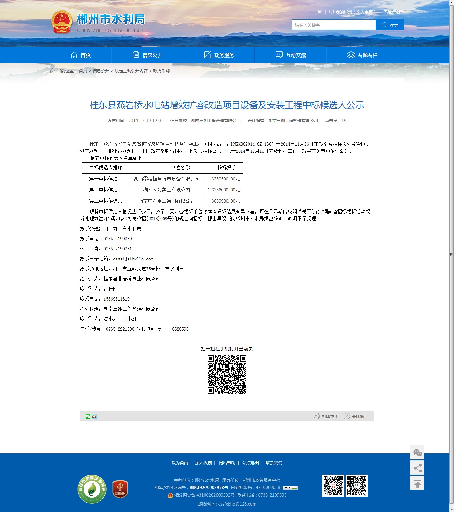 现将中标候选人情况进行公示,公示三天,各投标单位对本次评标结果有异议者,可在公示期内按照《关于修改<湖南省招标投标活动投诉处理办法>的通知》(湘发改招[2013]909号)的规定向招标人提出异议或向郴州市水利局提出投诉,逾期不予受理。