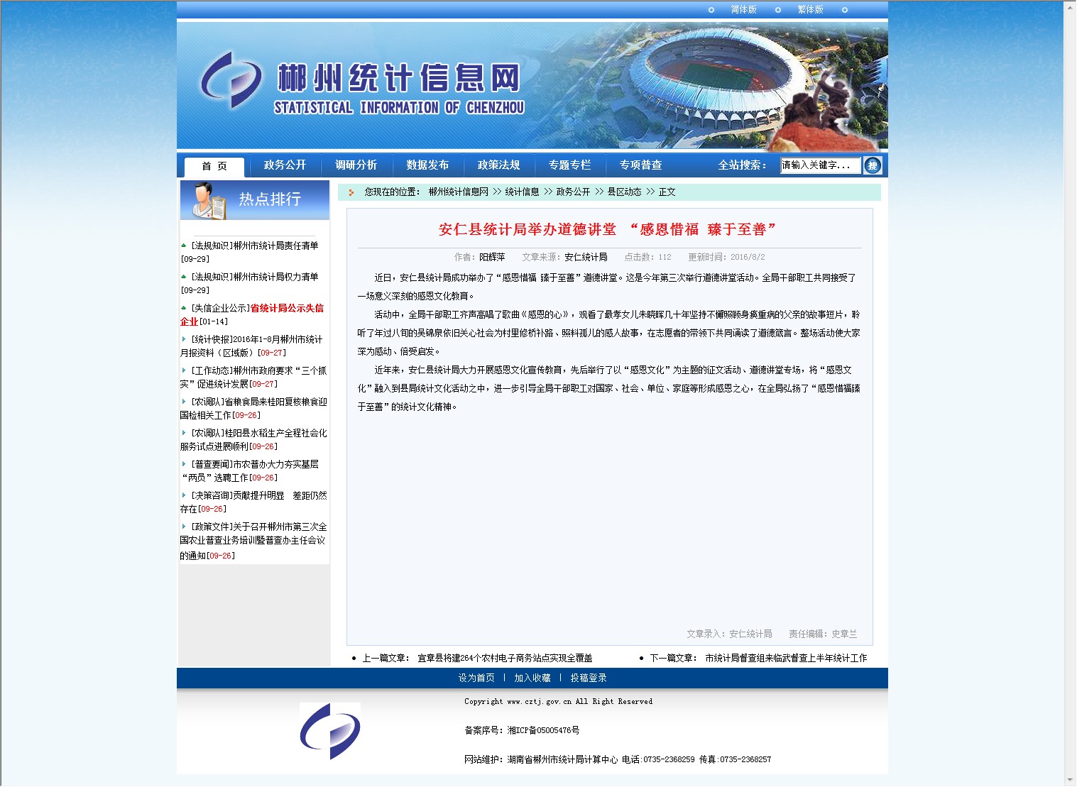 近年来,安仁县统计局大力开展感恩文化宣传教育,先后举行了以“感恩文化”为主题的征文活动、道德讲堂专场,将“感恩文化”融入到县局统计文化活动之中,进一步引导全局干部职工对国家、社会、单位、家庭等形成感恩之心,在全局弘扬了“感恩惜福臻于至善”的统计文化精神。