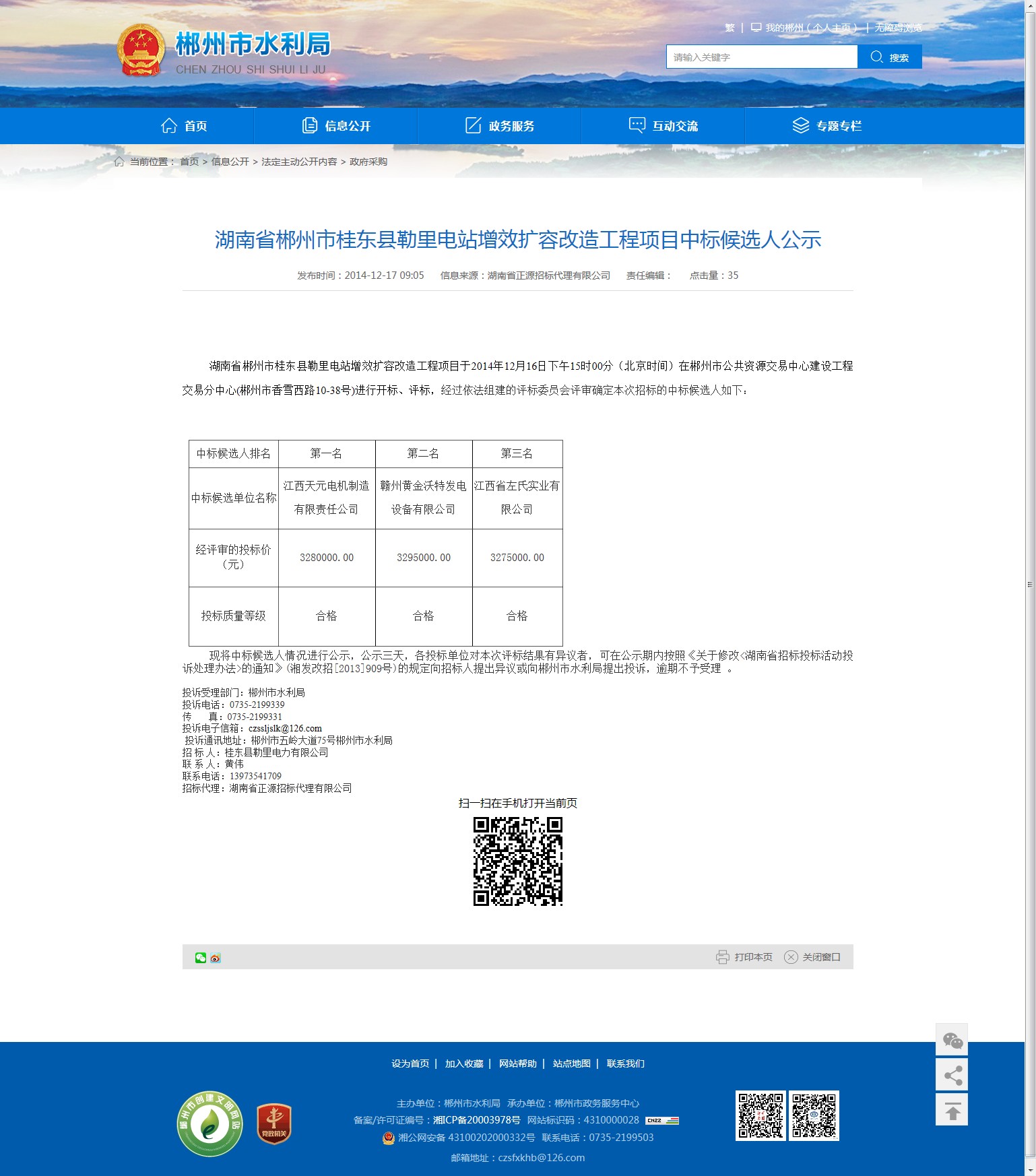 现将中标候选人情况进行公示,公示三天,各投标单位对本次评标结果有异议者,可在公示期内按照《关于修改<湖南省招标投标活动投诉处理办法>的通知》(湘发改招[2013]909号)的规定向招标人提出异议或向郴州市水利局提出投诉,逾期不予受理 。
