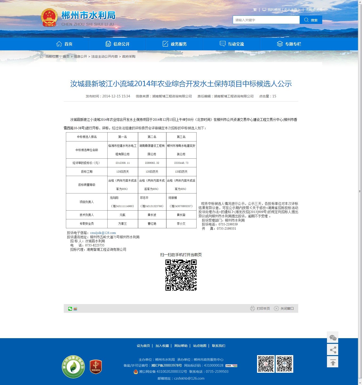 现将中标候选人情况进行公示,公示三天,各投标单位对本次评标结果有异议者,可在公示期内按照《关于修改<湖南省招标投标活动投诉处理办法>的通知》(湘发改招[2013]909号)的规定向招标人提出异议或向郴州市水利局提出投诉,逾期不予受理 。