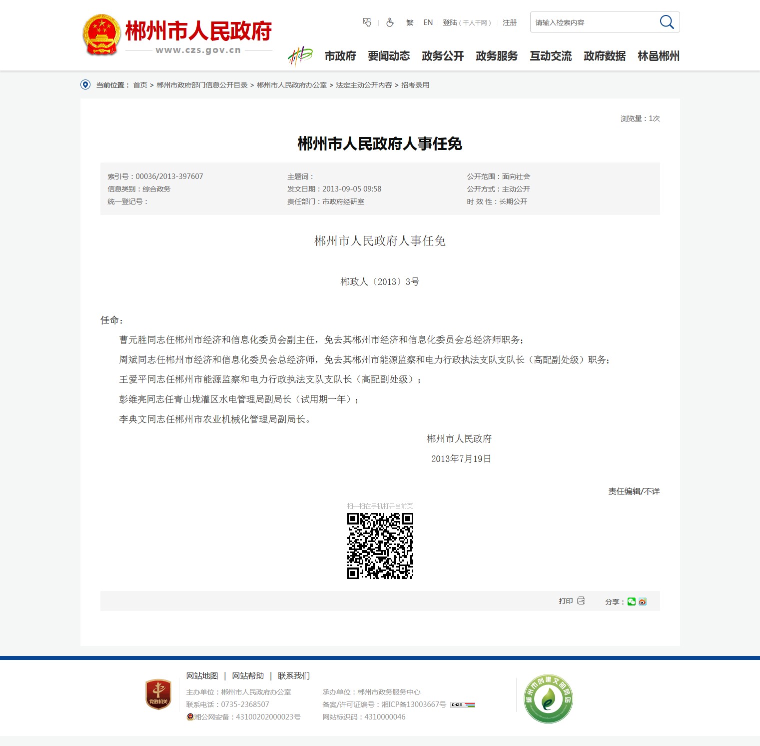 郴州市人民政府人事任免