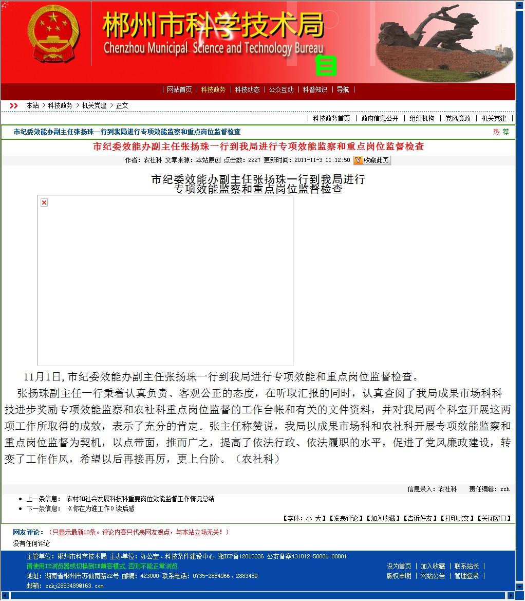 11月1日,市纪委效能办副主任张扬珠一行到我局进行专项效能和重点岗位监督检查。