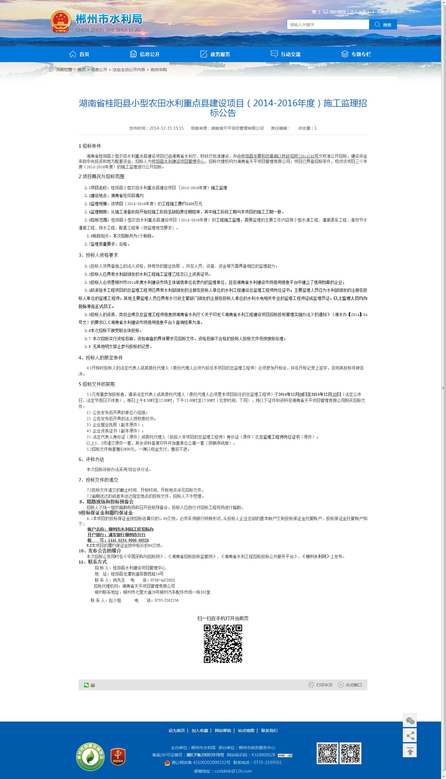 本次招标公告同时在《中国采购与招标网》、《湖南省招标投标监管网》、《湖南省水利工程招标投标公共服务平台》、《郴州水利网》上发布。