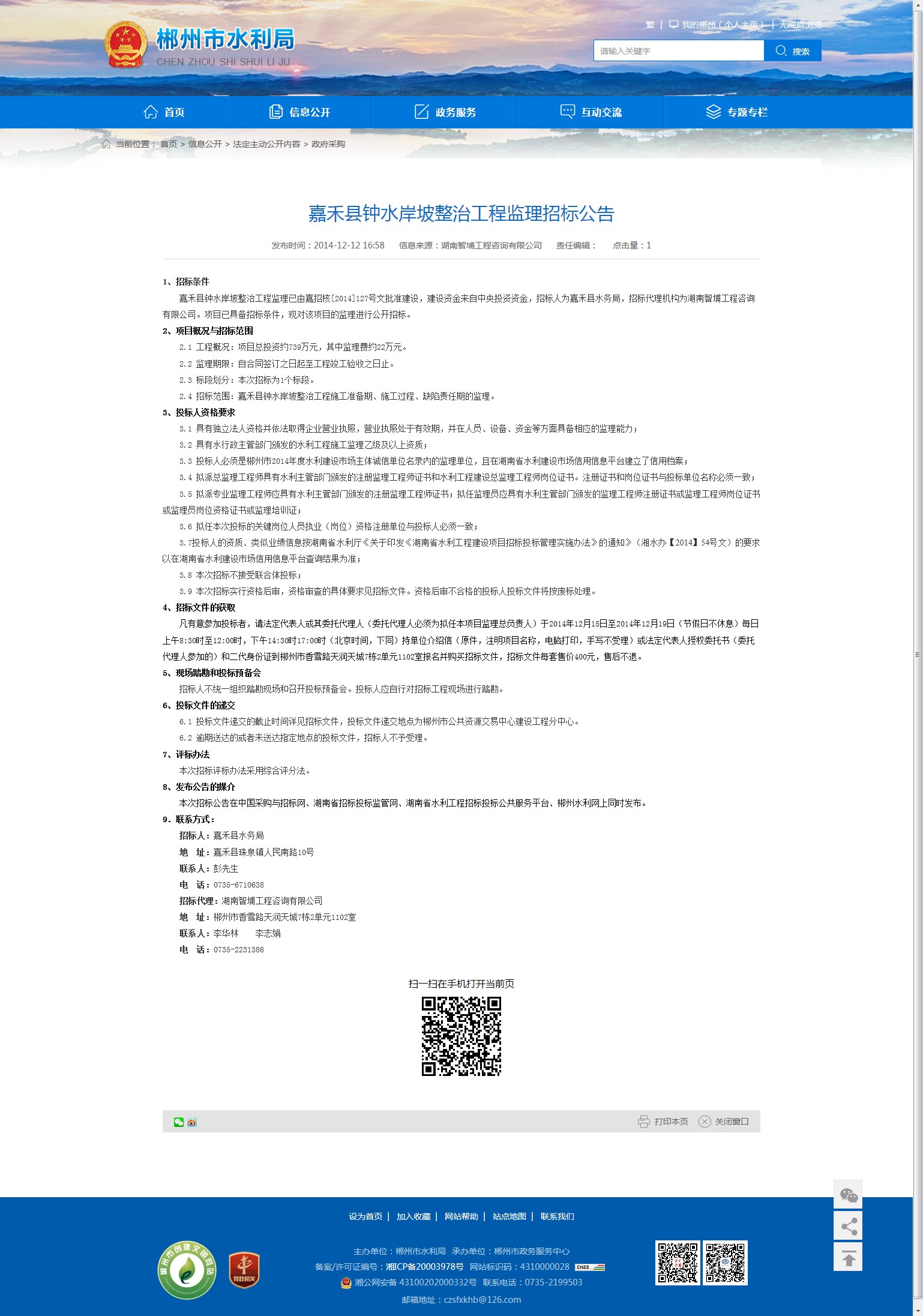 本次招标公告在中国采购与招标网、湖南省招标投标监管网、湖南省水利工程招标投标公共服务平台、郴州水利网上同时发布。