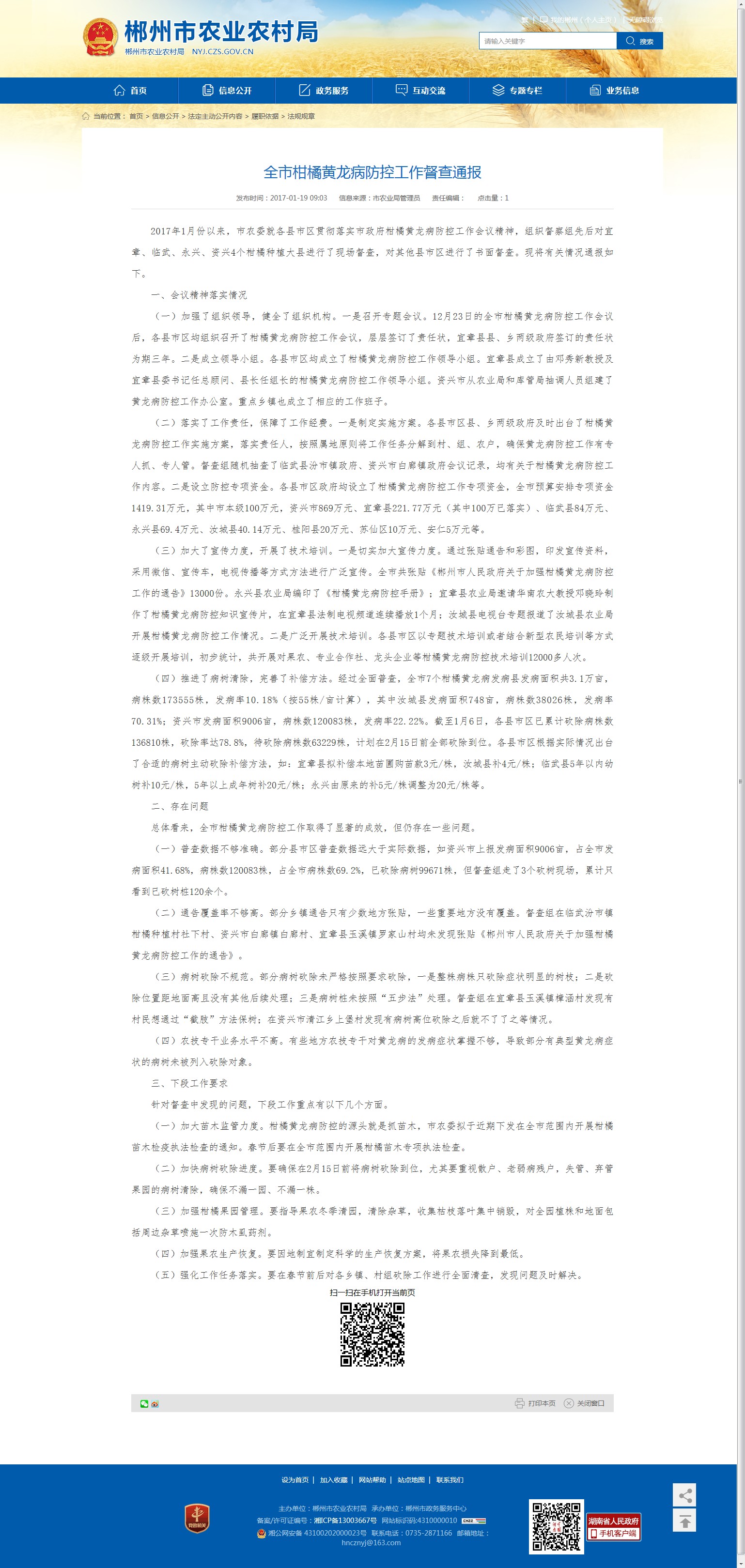 2017年1月份以来,市农委就各县市区贯彻落实市政府柑橘黄龙病防控工作会议精神,组织督察组先后对宜章、临武、永兴、资兴4个柑橘种植大县进行了现场督查,对其他县市区进行了书面督查。现将有关情况通报如下。