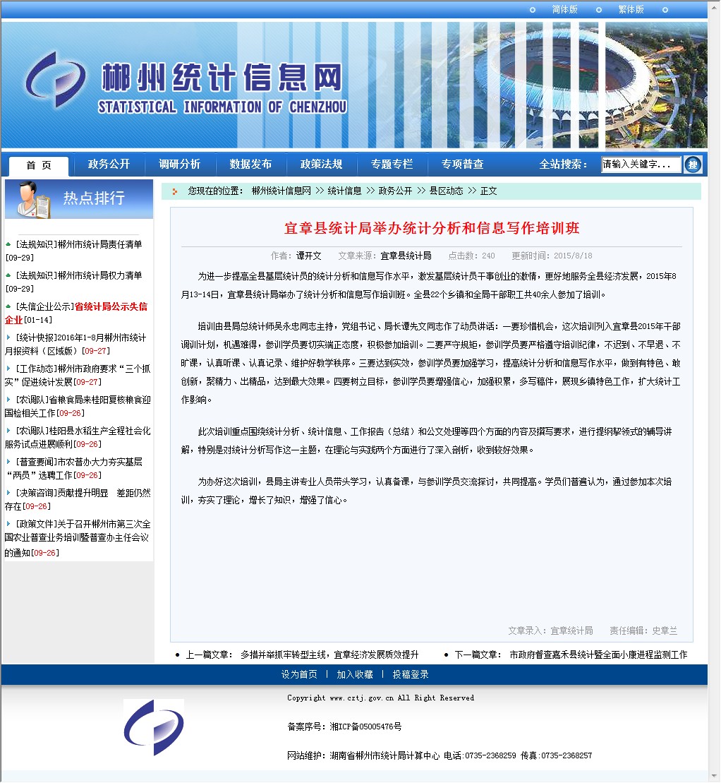 为进一步提高全县基层统计员的统计分析和信息写作水平,激发基层统计员干事创业的激情,更好地服务全县经济发展,2015年8月13-14日,宜章县统计局举办了统计分析和信息写作培训班。全县22个乡镇和全局干部职工共40余人参加了培训。
