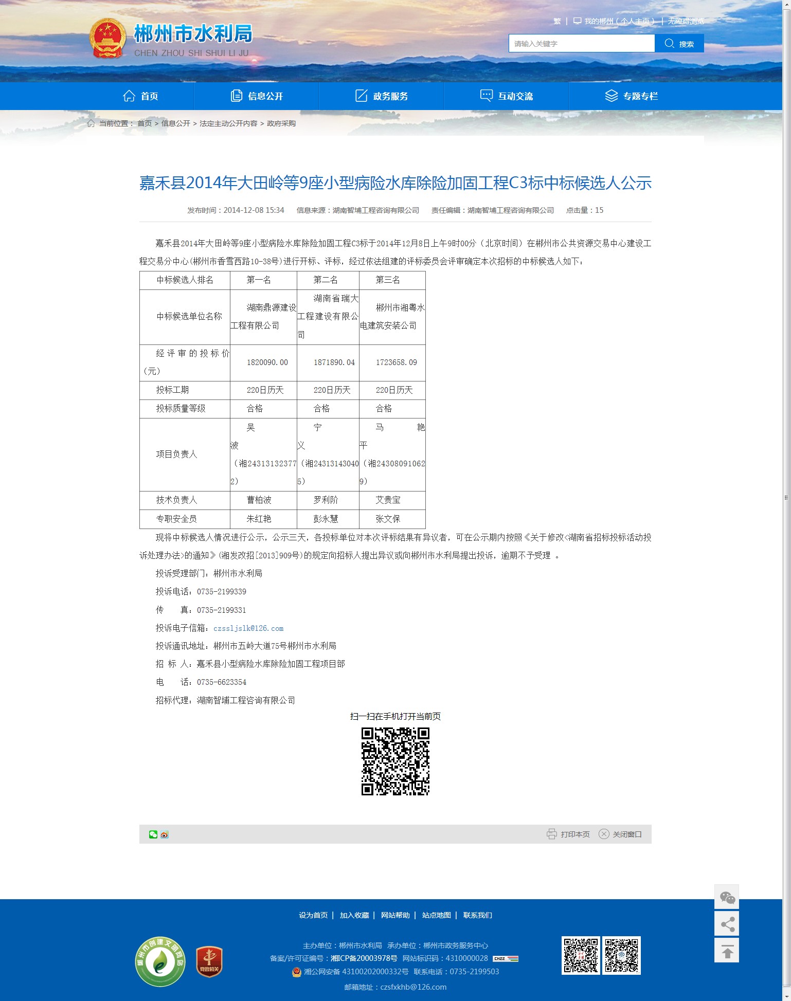 现将中标候选人情况进行公示,公示三天,各投标单位对本次评标结果有异议者,可在公示期内按照《关于修改<湖南省招标投标活动投诉处理办法>的通知》(湘发改招[2013]909号)的规定向招标人提出异议或向郴州市水利局提出投诉,逾期不予受理 。