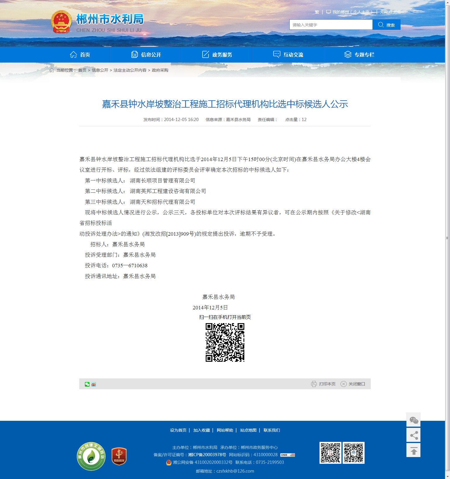 现将中标候选人情况进行公示,公示三天,各投标单位对本次评标结果有异议者,可在公示期内按照《关于修改<湖南省招标投标活