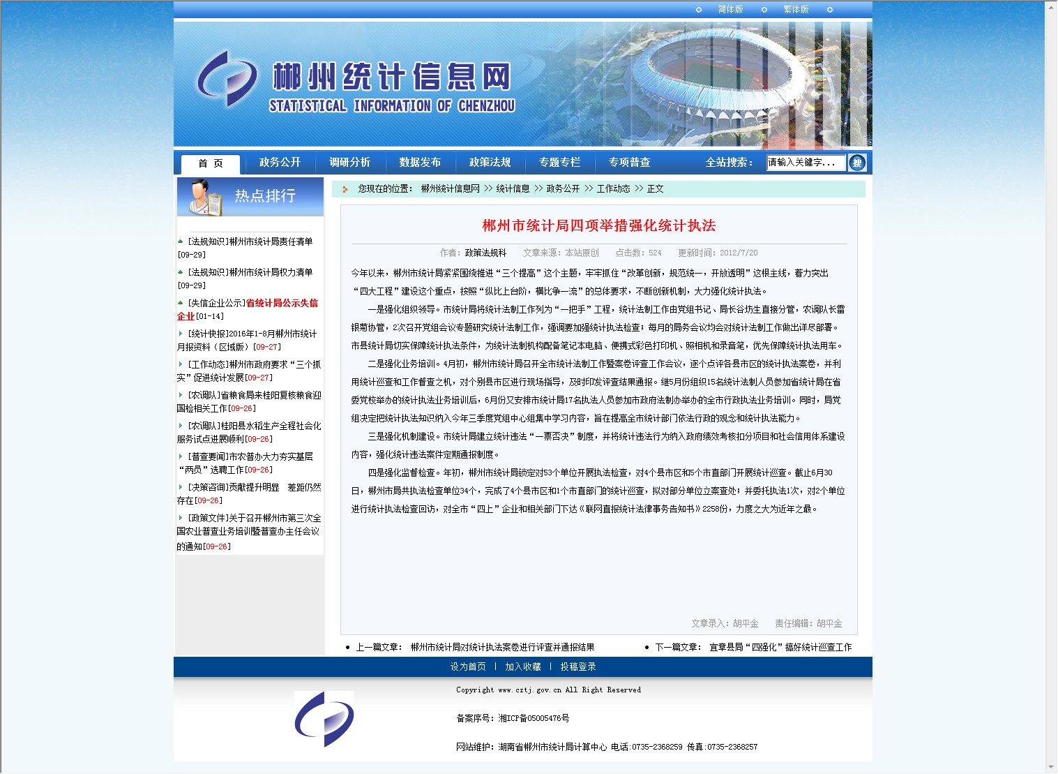今年以来,郴州市统计局紧紧围绕推进“三个提高”这个主题,牢牢抓住“改革创新,规范统一,开放透明”这根主线,着力突出 “四大工程”建设这个重点,按照“纵比上台阶,横比争一流”的总体要求,不断创新机制,大力强化统计执法。