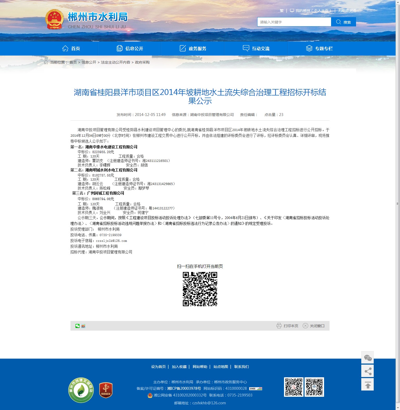 投诉通讯地址:郴州市水利局