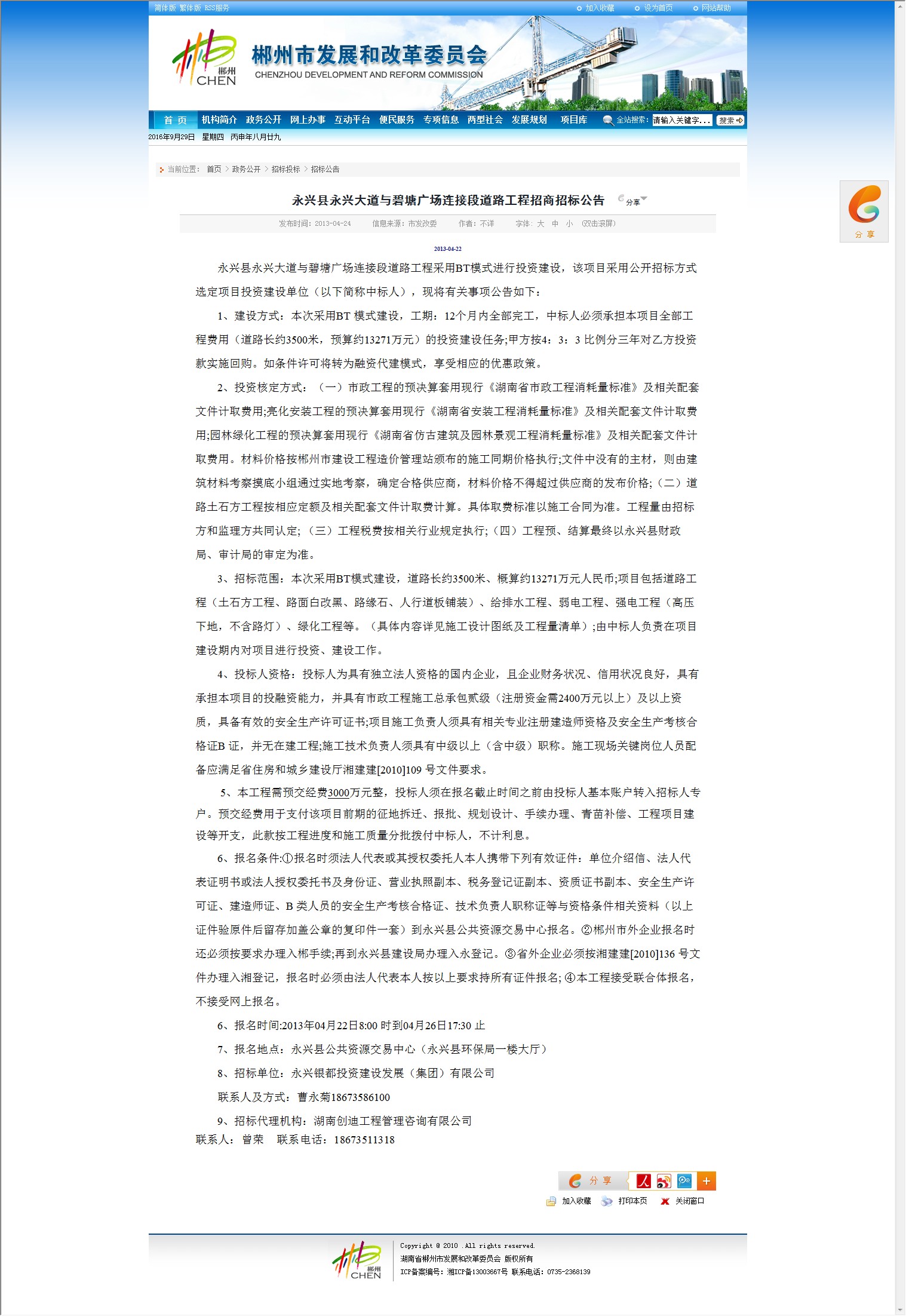 永兴县永兴大道与碧塘广场连接段道路工程采用BT模式进行投资建设,该项目采用公开招标方式选定项目投资建设单位(以下简称中标人),现将有关事项公告如下: 1、建设方式:本次采用BT 模式建设,工期:12个月内全部完工,中标人必须承担本项目全部工程费用(道路长约3500米,预算约13271万元)的投资建设任务;甲方按4:3:3 比例分三年对乙方投资款实施回购。如条件许可将转为融资代建模式,享受相应的优惠政策。 2、投资核定方式:(一)市政工程的预决算套用现行《湖南省市政工程消耗量标准》及相关配套文件计取费用;亮化安装工程的预决算套用现行《湖南省安装工程消耗量标准》及相关配套文件计取费用;园林绿化工程的预决算套用现行《湖南省仿古建筑及园林景观工程消耗量标准》及相关配套文件计取费用。材料价格按郴州市建设工程造价管理站颁布的施工同期价格执行;文件中没有的主材,则由建筑材料考察摸底小组通过实地考察,确定合格供应商,材料价格不得超过供应商的发布价格;(二)道路土石方工程按相应定额及相关配套文件计取费计算。具体取费标准以施工合同为准。工程量由招标方和监理方共同认定; (三)工程税费按相关行业规定执行;(四)工程预、结算最终以永兴县财政局、审计局的审定为准。 3、招标范围:本次采用BT模式建设,道路长约3500米、概算约13271万元人民币;项目包括道路工程(土石方工程、路面白改黑、路缘石、人行道板铺装)、给排水工程、弱电工程、强电工程(高压下地,不含路灯)、绿化工程等。(具体内容详见施工设计图纸及工程量清单);由中标人负责在项目建设期内对项目进行投资、建设工作。 4、投标人资格:投标人为具有独立法人资格的国内企业,且企业财务状况、信用状况良好,具有承担本项目的投融资能力,并具有市政工程施工总承包贰级(注册资金需2400万元以上)及以上资质,具备有效的安全生产许可证书;项目施工负责人须具有相关专业注册建造师资格及安全生产考核合格证B 证,并无在建工程;施工技术负责人须具有中级以上(含中级)职称。施工现场关键岗位人员配备应满足省住房和城乡建设厅湘建建[2010]109 号文件要求。 5、本工程需预交经费3000万元整,投标人须在报名截止时间之前由投标人基本账户转入招标人专户。预交经费用于支付该项目前期的征地拆迁、报批、规划设计、手续办理、青苗补偿、工程项目建设等开支,此款按工程进度和施工质量分批拨付中标人,不计利息。 6、报名条件:①报名时须法人代表或其授权委托人本人携带下列有效证件:单位介绍信、法人代表证明书或法人授权委托书及身份证、营业执照副本、税务登记证副本、资质证书副本、安全生产许可证、建造师证、B 类人员的安全生产考核合格证、技术负责人职称证等与资格条件相关资料(以上证件验原件后留存加盖公章的复印件一套)到永兴县公共资源交易中心报名。②郴州市外企业报名时还必须按要求办理入郴手续;再到永兴县建设局办理入永登记。③省外企业必须按湘建建[2010]136 号文件办理入湘登记,报名时必须由法人代表本人按以上要求持所有证件报名; ④本工程接受联合体报名,不接受网上报名。 6、报名时间:2013年04月22日8:00 时到04月26日17:30 止 7、报名地点:永兴县公共资源交易中心(永兴县环保局一楼大厅) 8、招标单位:永兴银都投资建设发展(集团)有限公司 联系人及方式:曹永菊18673586100 9、招标代理机构:湖南创迪工程管理咨询有限公司 联系人:曾荣 联系电话:18673511318 |
