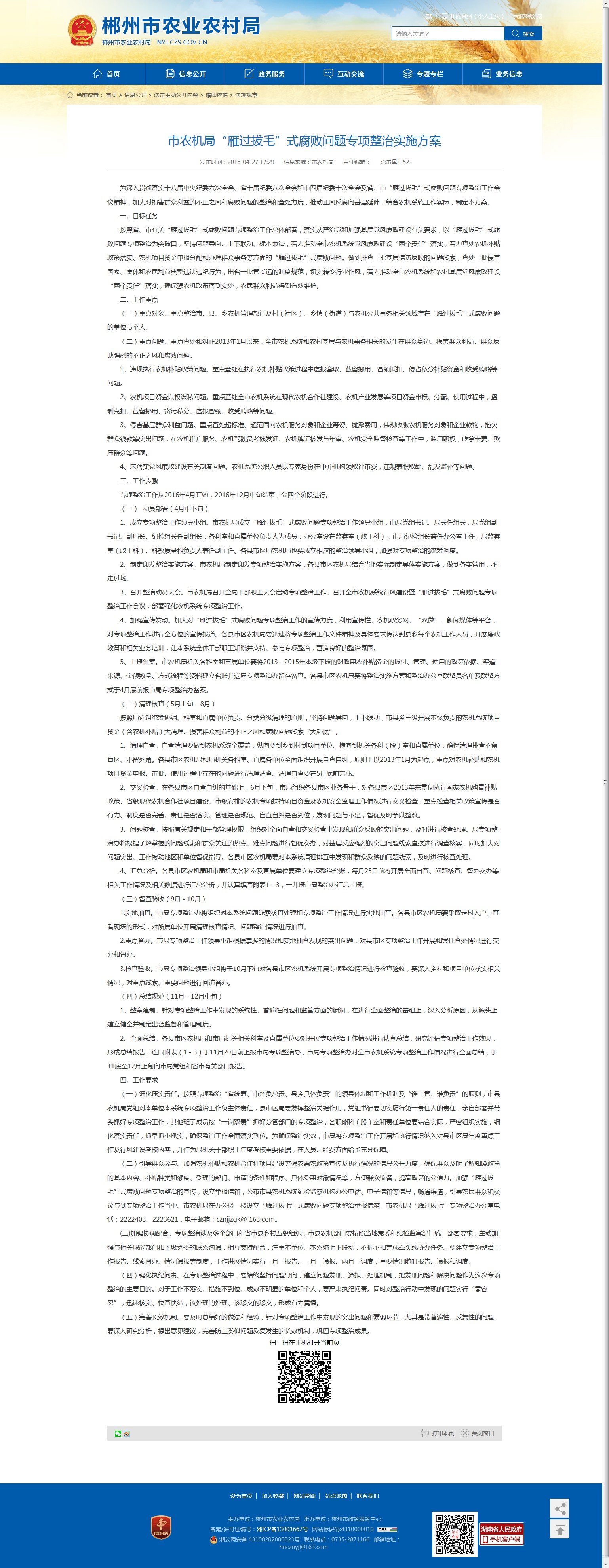 (二)引导群众参与。加强农机补贴和农机合作社项目建设等强农惠农政策宣传及执行情况的信息公开力度,确保群众及时了解知晓政策的基本内容、补贴种类和额度、受理的部门、申请的条件和程序、具体受惠对象情况等,方便群众监督,提高政策的公信力。加强“雁过拔毛”式腐败问题专项整治的宣传,设立举报信箱,公布市县农机系统纪检监察机构办公电话、电子信箱等信息,畅通渠道,引导农民群众积极参与到专项整治工作当中。市农机局在办公楼一楼设立“雁过拔毛”式腐败问题专项整治举报信箱,市农机局“雁过拔毛”专项整治办公室电话:2222403、2223621,电子邮箱:cznjjzgk@ 163.com。