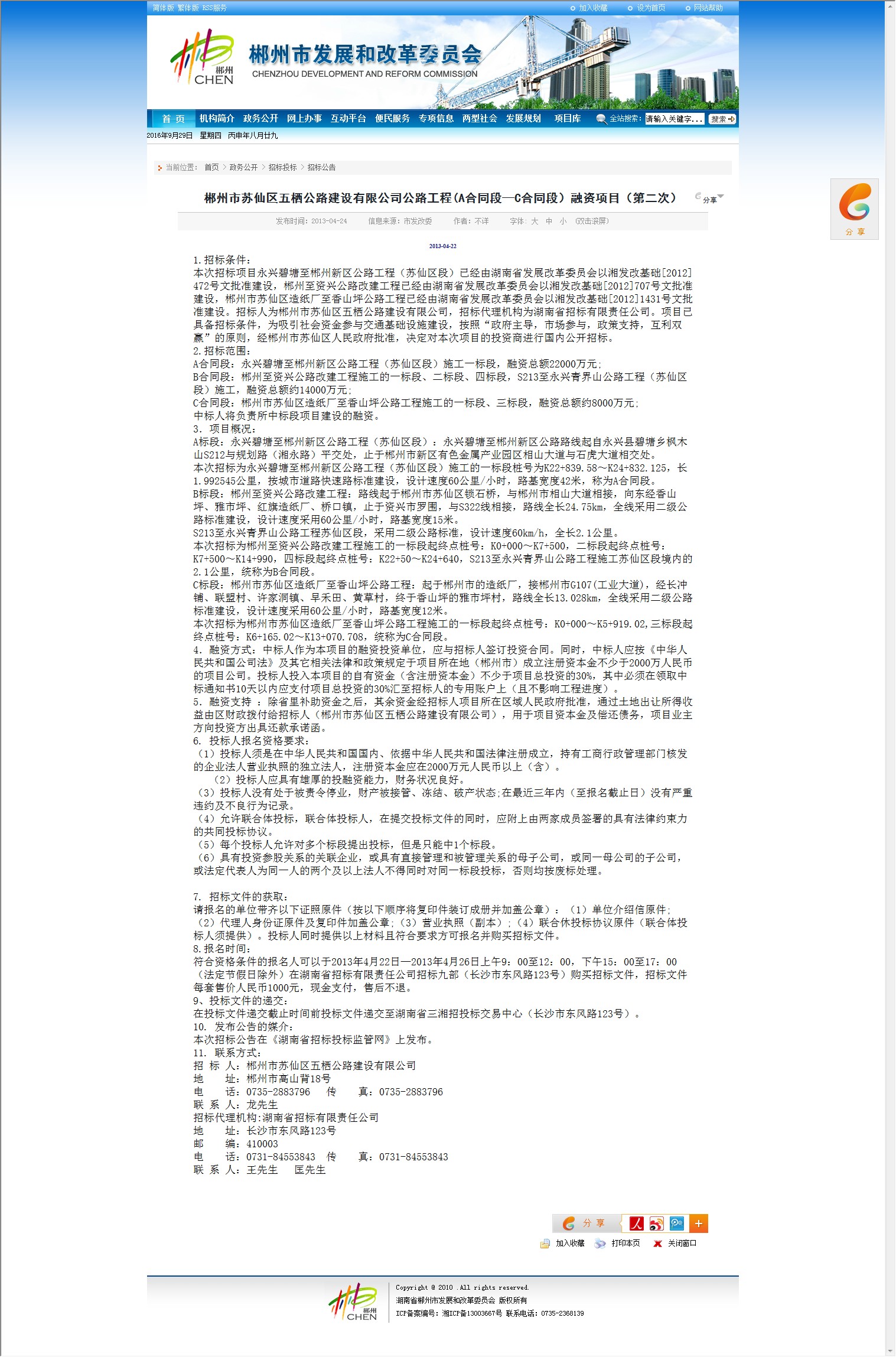 7. 招标文件的获取: 请报名的单位带齐以下证照原件(按以下顺序将复印件装订成册并加盖公章):(1)单位介绍信原件;(2)代理人身份证原件及复印件加盖公章;(3)营业执照(副本);(4)联合休投标协议原件(联合体投标人须提供)。投标人同时提供以上材料且符合要求方可报名并购买招标文件。 8.报名时间: 符合资格条件的报名人可以于2013年4月22日—2013年4月26日上午9:00至12:00,下午15:00至17:00(法定节假日除外)在湖南省招标有限责任公司招标九部(长沙市东风路123号)购买招标文件,招标文件每套售价人民币1000元,现金支付,售后不退。 9、投标文件的递交: 在投标文件递交截止时间前投标文件递交至湖南省三湘招投标交易中心(长沙市东风路123号)。 10. 发布公告的媒介: 本次招标公告在《湖南省招标投标监管网》上发布。 11. 联系方式: 招 标 人:郴州市苏仙区五栖公路建设有限公司 地 址:郴州市高山背18号 电 话:0735-2883796 传 真:0735-2883796 联 系 人:龙先生 招标代理机构:湖南省招标有限责任公司 地 址:长沙市东风路123号 邮 编:410003 电 话:0731-84553843 传 真:0731-84553843 联 系 人:王先生 匡先生 |