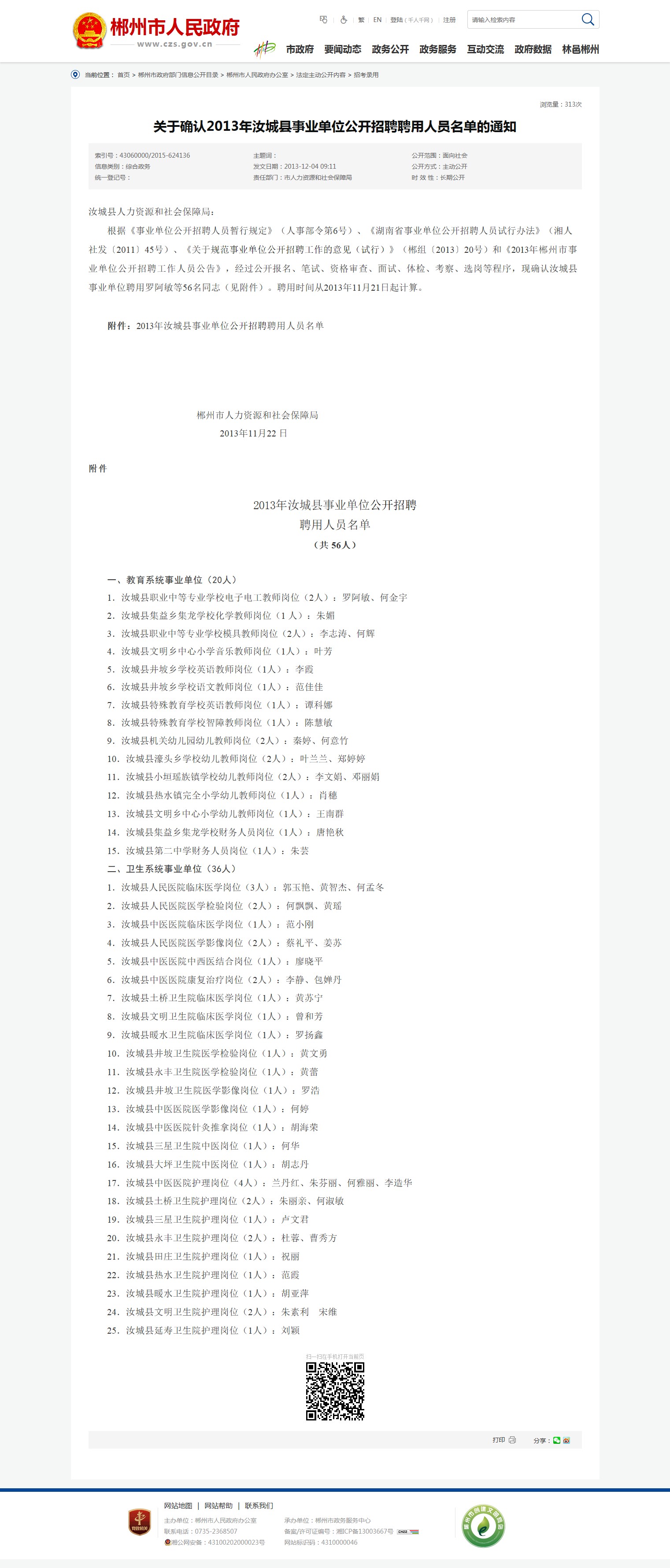 根据《事业单位公开招聘人员暂行规定》(人事部令第6号)、《湖南省事业单位公开招聘人员试行办法》(湘人社发〔2011〕45号)、《关于规范事业单位公开招聘工作的意见(试行)》(郴组〔2013〕20号)和《2013年郴州市事业单位公开招聘工作人员公告》,经过公开报名、笔试、资格审查、面试、体检、考察、选岗等程序,现确认汝城县事业单位聘用罗阿敏等56名同志(见附件)。聘用时间从2013年11月21日起计算。