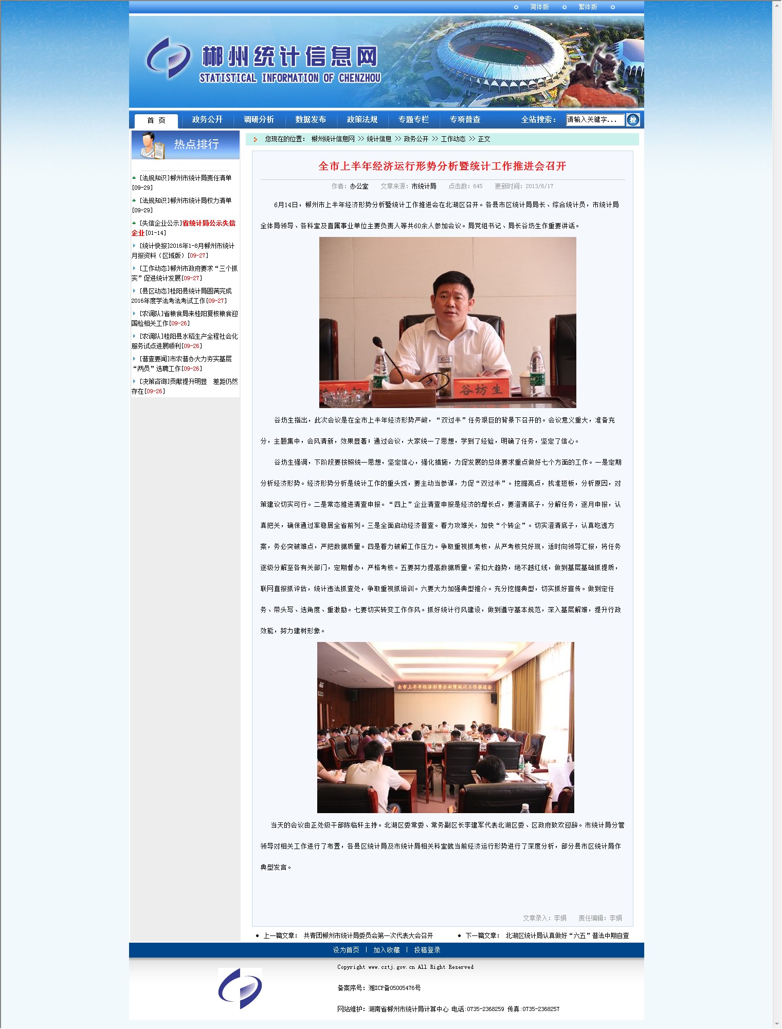 当天的会议由正处级干部陈临轩主持。北湖区委常委、常务副区长李建军代表北湖区委、区政府致欢迎辞。市统计局分管领导对相关工作进行了布置,各县区统计局及市统计局相关科室就当前经济运行形势进行了深度分析,部分县市区统计局作典型发言。