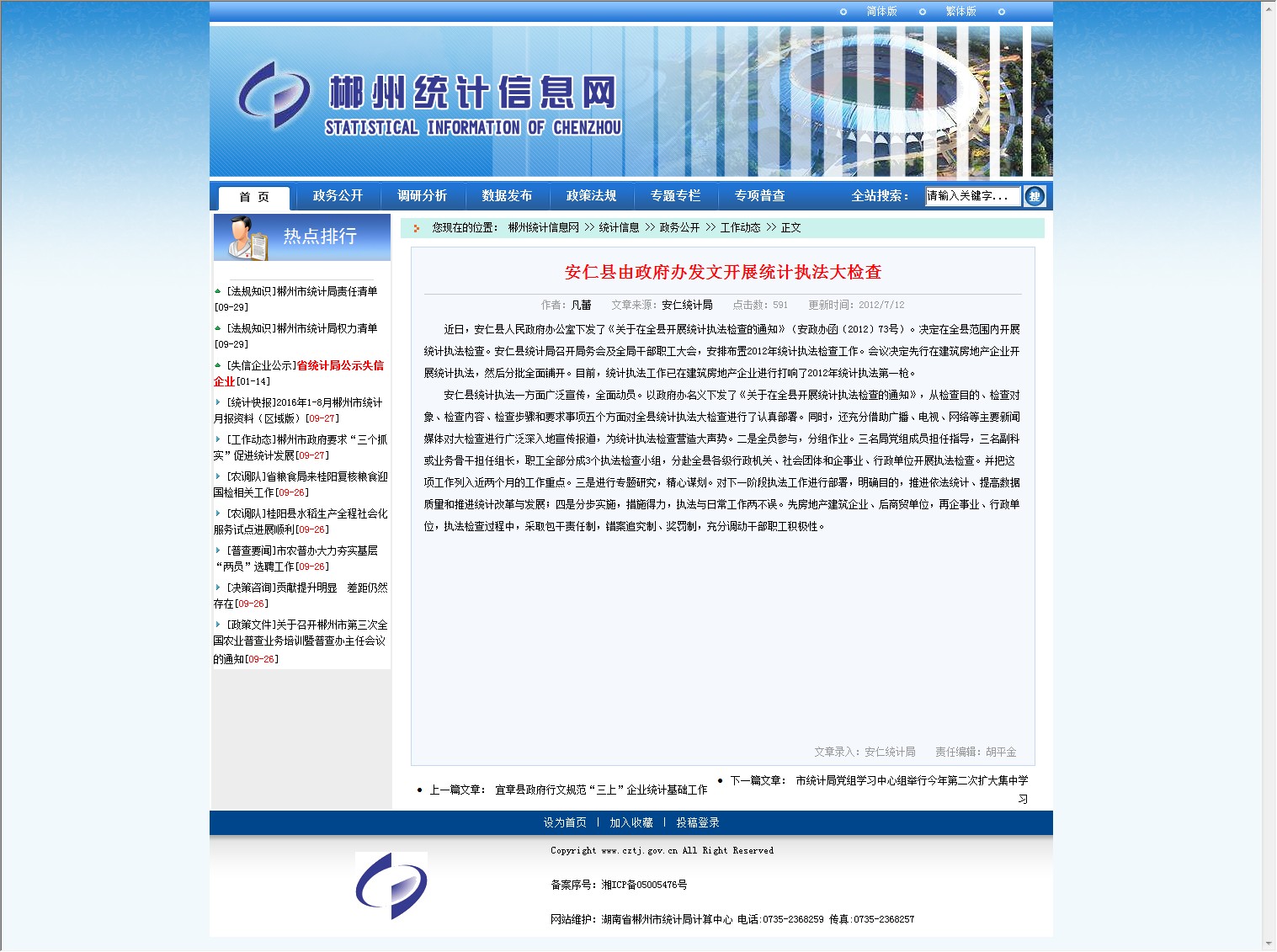 近日,安仁县人民政府办公室下发了《关于在全县开展统计执法检查的通知》(安政办函〔2012〕73号)。决定在全县范围内开展统计执法检查。安仁县统计局召开局务会及全局干部职工大会,安排布置2012年统计执法检查工作。会议决定先行在建筑房地产企业开展统计执法,然后分批全面铺开。目前,统计执法工作已在建筑房地产企业进行打响了2012年统计执法第一枪。