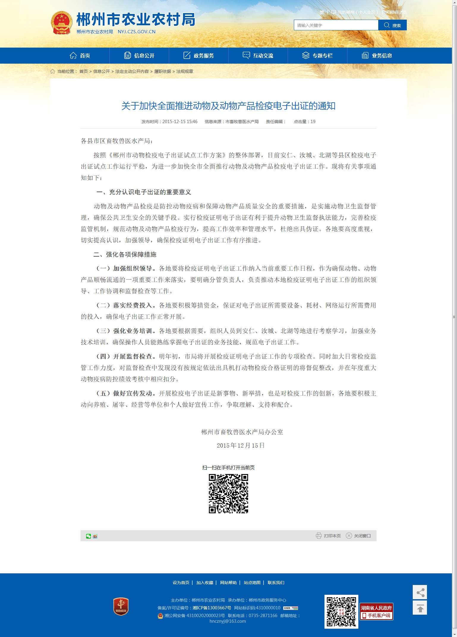 按照《郴州市动物检疫电子出证试点工作方案》的整体部署,目前安仁、汝城、北湖等县区检疫电子出证试点工作运行平稳,为进一步加快全市全面推行动物及动物产品检疫电子出证工作。现将有关事项通知如下: