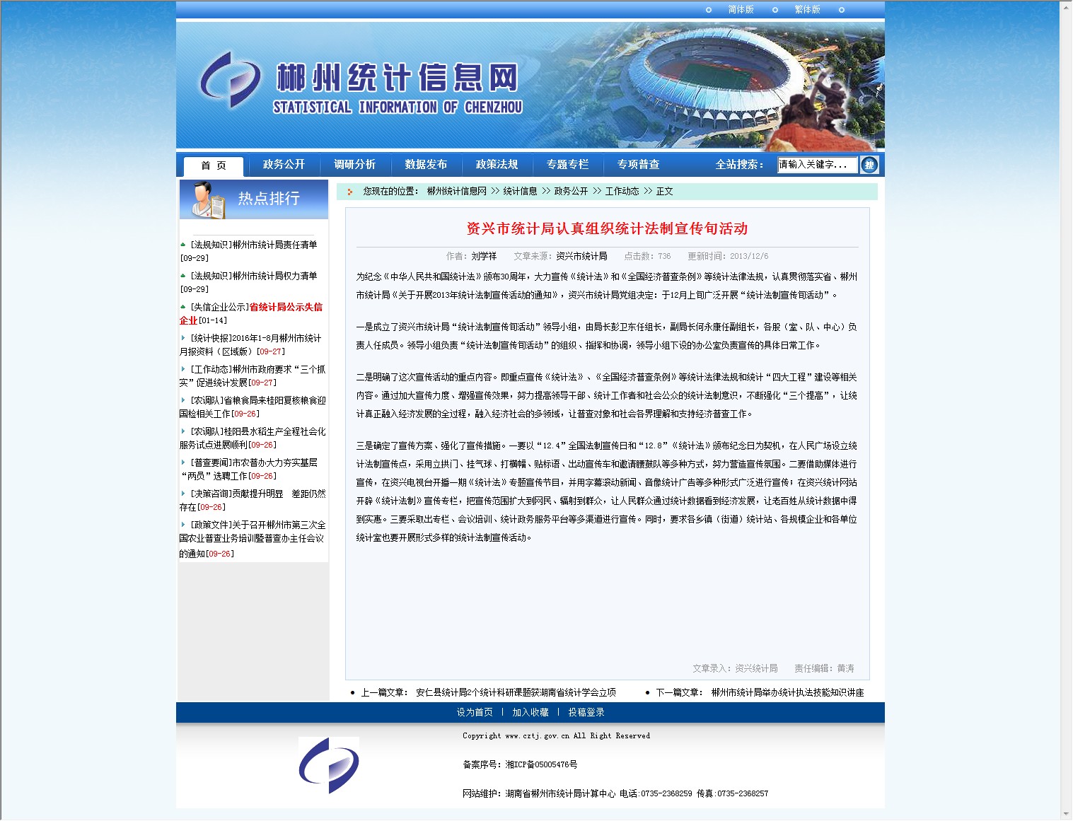 为纪念《中华人民共和国统计法》颁布30周年,大力宣传《统计法》和《全国经济普查条例》等统计法律法规,认真贯彻落实省、郴州市统计局《关于开展2013年统计法制宣传活动的通知》,资兴市统计局党组决定:于12月上旬广泛开展“统计法制宣传旬活动”。