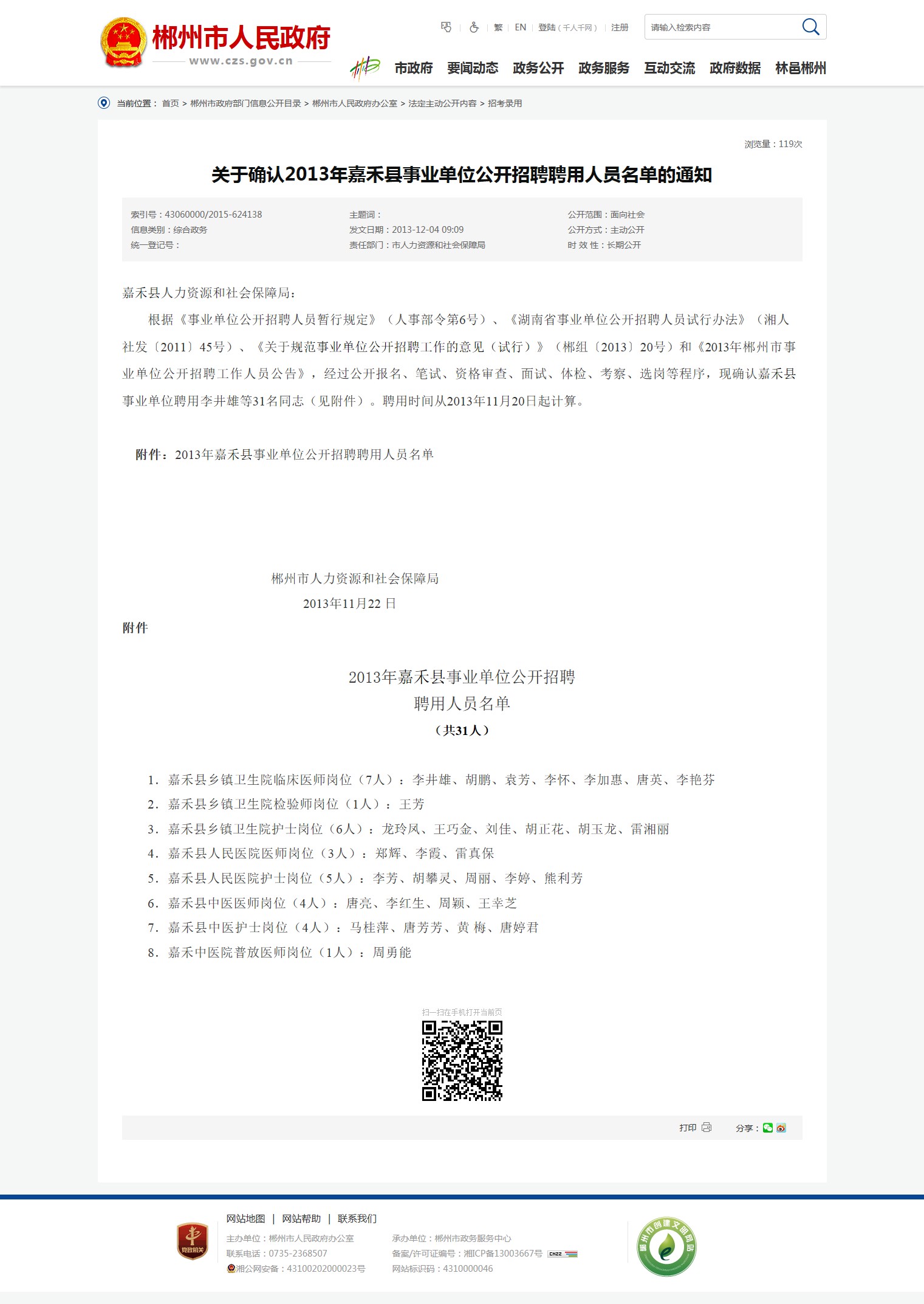 根据《事业单位公开招聘人员暂行规定》(人事部令第6号)、《湖南省事业单位公开招聘人员试行办法》(湘人社发〔2011〕45号)、《关于规范事业单位公开招聘工作的意见(试行)》(郴组〔2013〕20号)和《2013年郴州市事业单位公开招聘工作人员公告》,经过公开报名、笔试、资格审查、面试、体检、考察、选岗等程序,现确认嘉禾县事业单位聘用李井雄等31名同志(见附件)。聘用时间从2013年11月20日起计算。