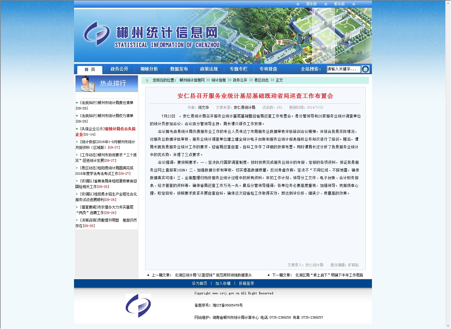 7月23日 ,安仁县统计局召开服务业统计基层基础暨迎省局巡查工作布置会。县分管领导和20家服务业统计调查单位的统计员参加会议,会议由分管领导主持,局长谭兴禄作工作安排。