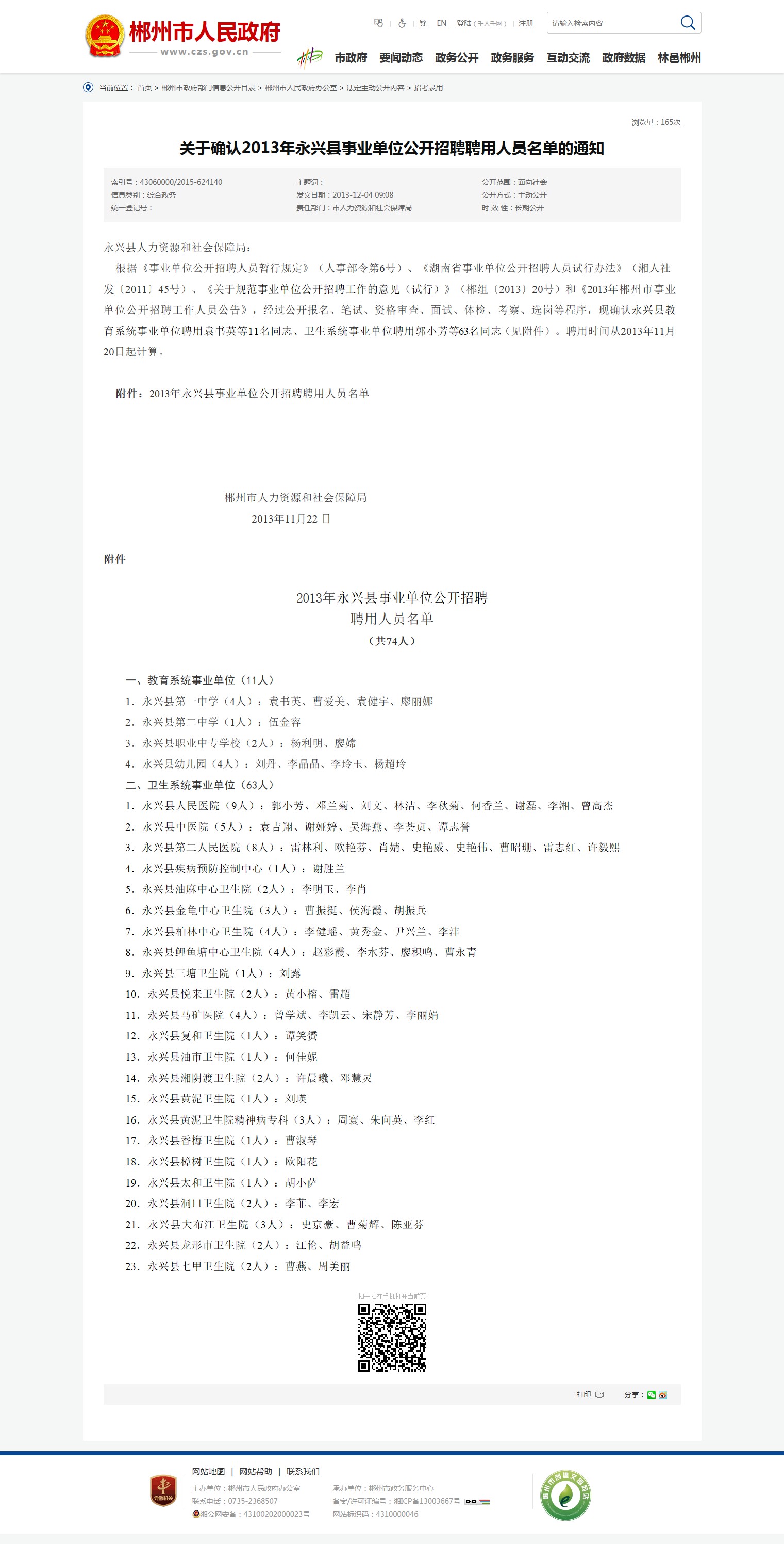 根据《事业单位公开招聘人员暂行规定》(人事部令第6号)、《湖南省事业单位公开招聘人员试行办法》(湘人社发〔2011〕45号)、《关于规范事业单位公开招聘工作的意见(试行)》(郴组〔2013〕20号)和《2013年郴州市事业单位公开招聘工作人员公告》,经过公开报名、笔试、资格审查、面试、体检、考察、选岗等程序,现确认永兴县教育系统事业单位聘用袁书英等11名同志、卫生系统事业单位聘用郭小芳等63名同志(见附件)。聘用时间从2013年11月20日起计算。
