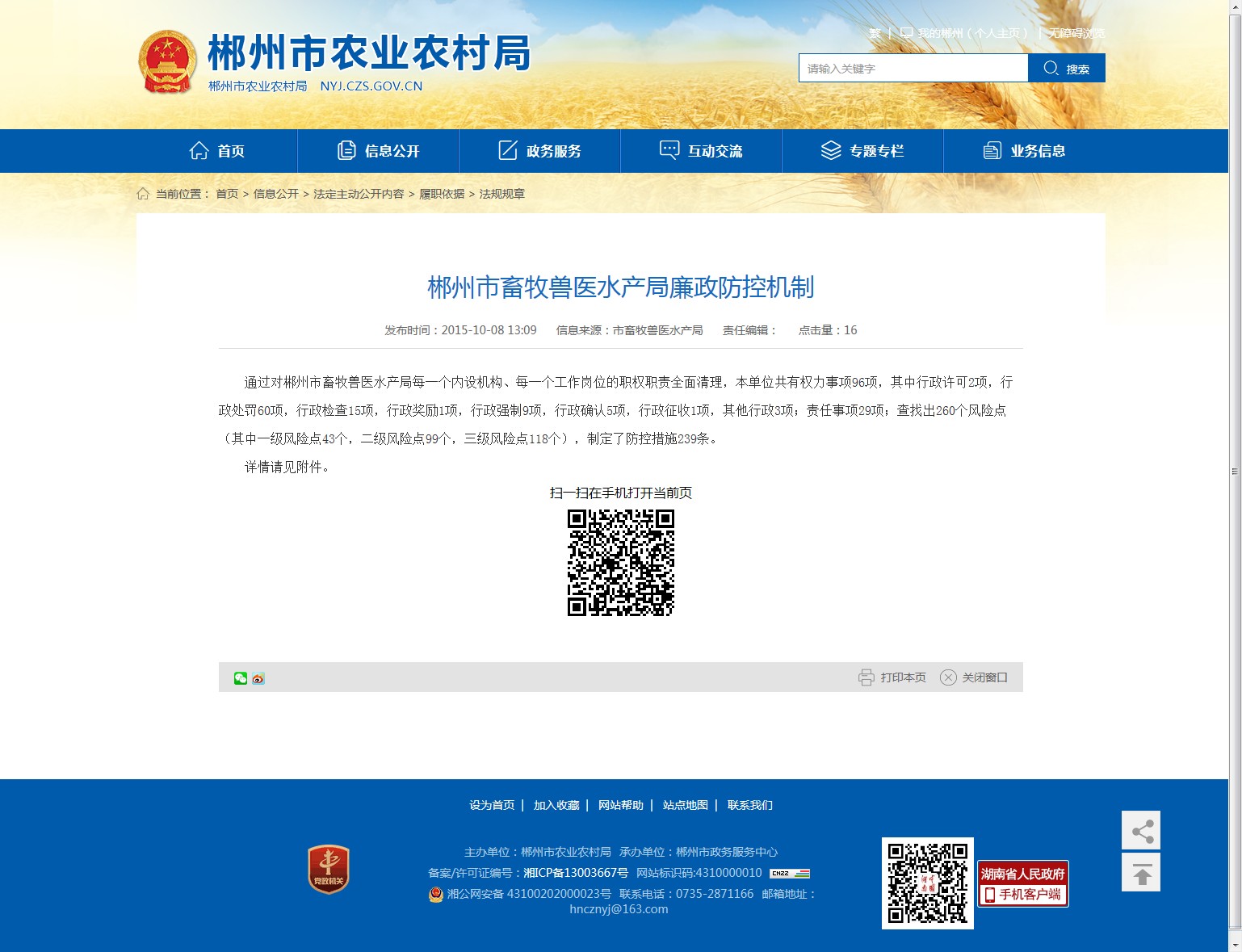 通过对郴州市畜牧兽医水产局每一个内设机构、每一个工作岗位的职权职责全面清理,本单位共有权力事项96项,其中行政许可2项,行政处罚60项,行政检查15项,行政奖励1项,行政强制9项,行政确认5项,行政征收1项,其他行政3项;责任事项29项;查找出260个风险点(其中一级风险点43个,二级风险点99个,三级风险点118个),制定了防控措施239条。