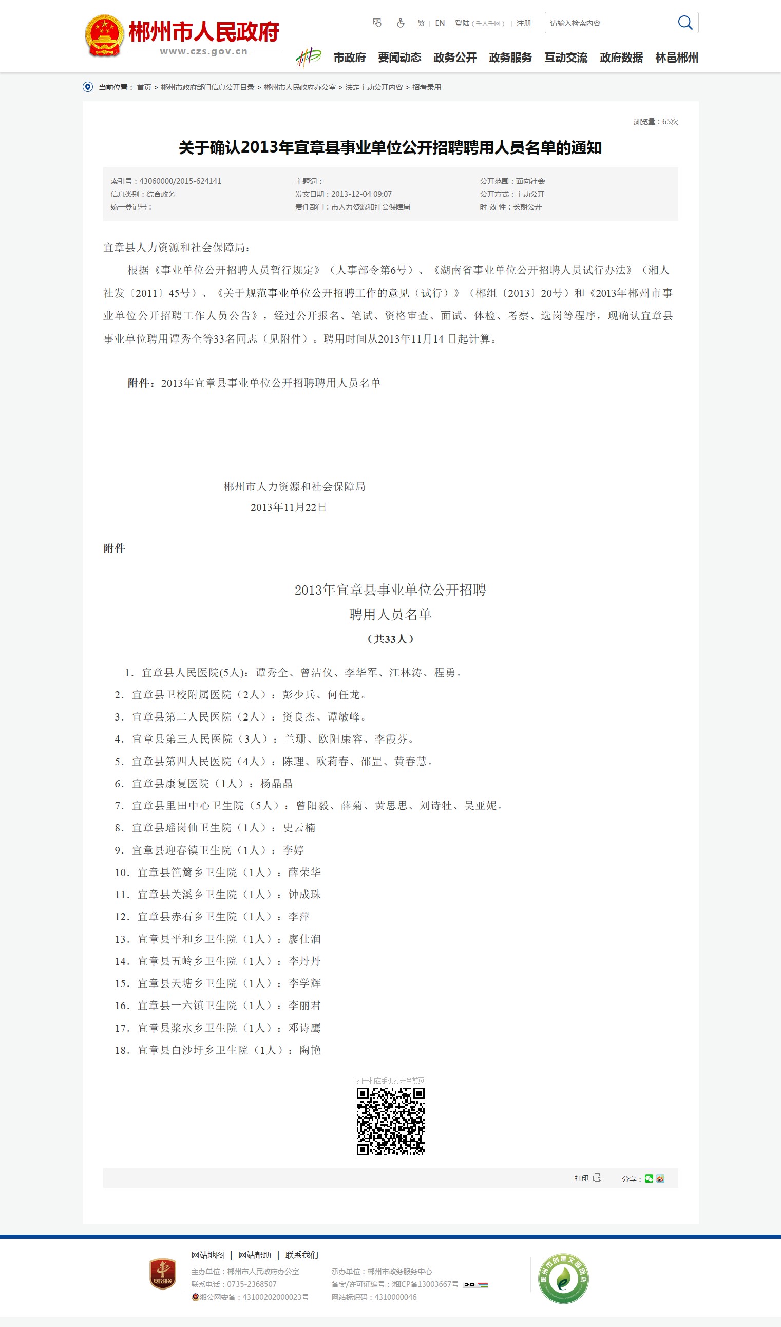 根据《事业单位公开招聘人员暂行规定》(人事部令第6号)、《湖南省事业单位公开招聘人员试行办法》(湘人社发〔2011〕45号)、《关于规范事业单位公开招聘工作的意见(试行)》(郴组〔2013〕20号)和《2013年郴州市事业单位公开招聘工作人员公告》,经过公开报名、笔试、资格审查、面试、体检、考察、选岗等程序,现确认宜章县事业单位聘用谭秀全等33名同志(见附件)。聘用时间从2013年11月14 日起计算。