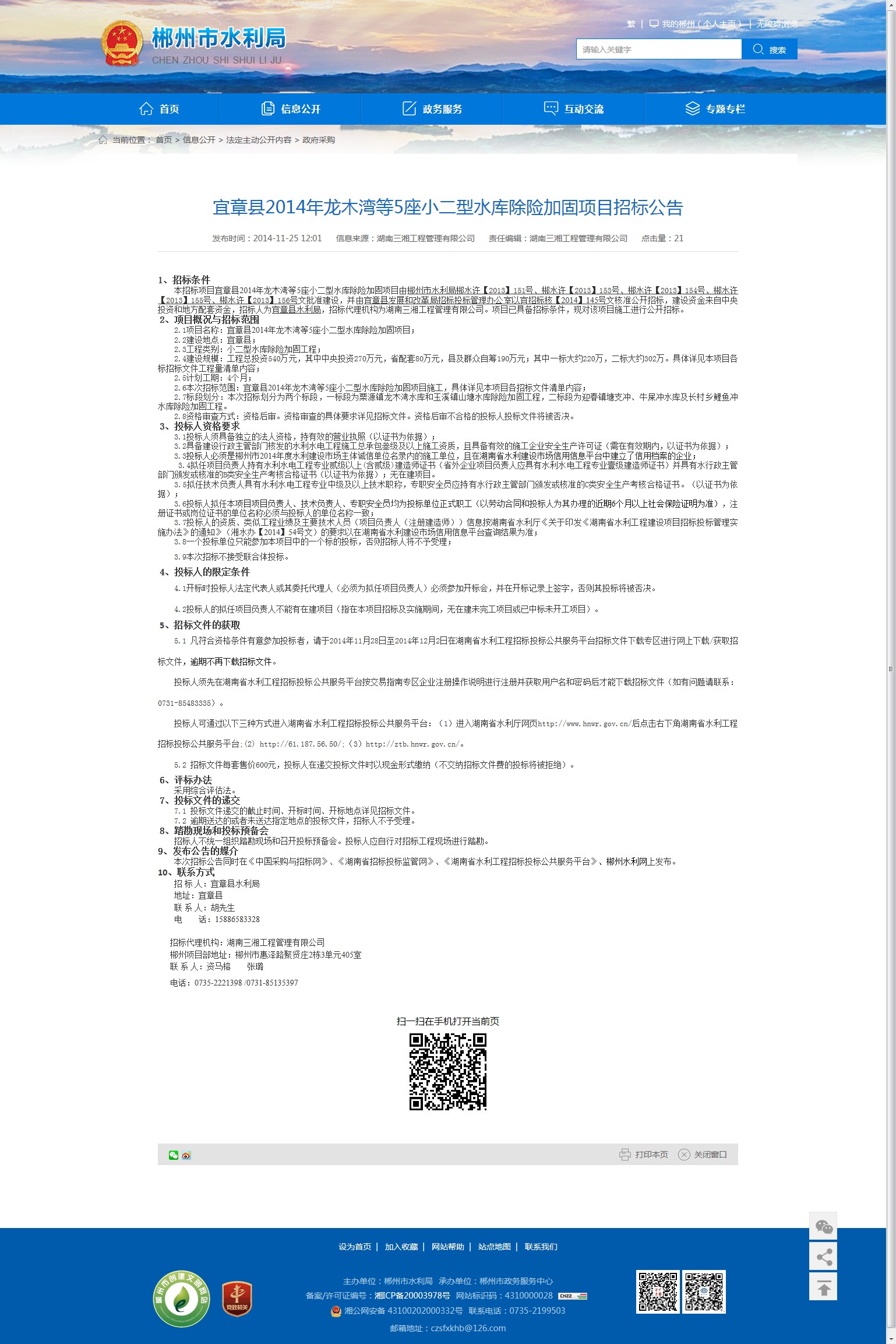 本次招标公告同时在《中国采购与招标网》、《湖南省招标投标监管网》、《湖南省水利工程招标投标公共服务平台》、郴州水利网上发布。