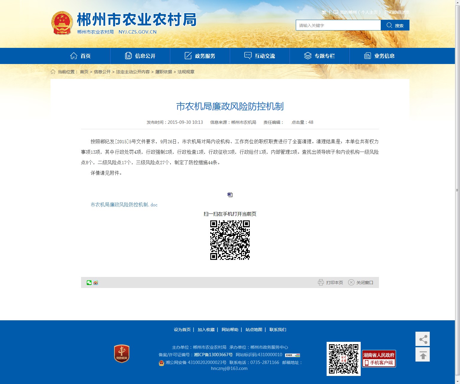 按照郴纪发[2015]5号文件要求,9月26日,市农机局对局内设机构、工作岗位的职权职责进行了全面清理。清理结果是:本单位共有权力事项13项,其中行政处罚4项,行政强制2项,行政检查1项,行政征收3项,行政给付1项,内部管理2项。查找出领导班子和内设机构一级风险点8个,二级风险点17个,三级风险点27个,制定了防控措施44条。
