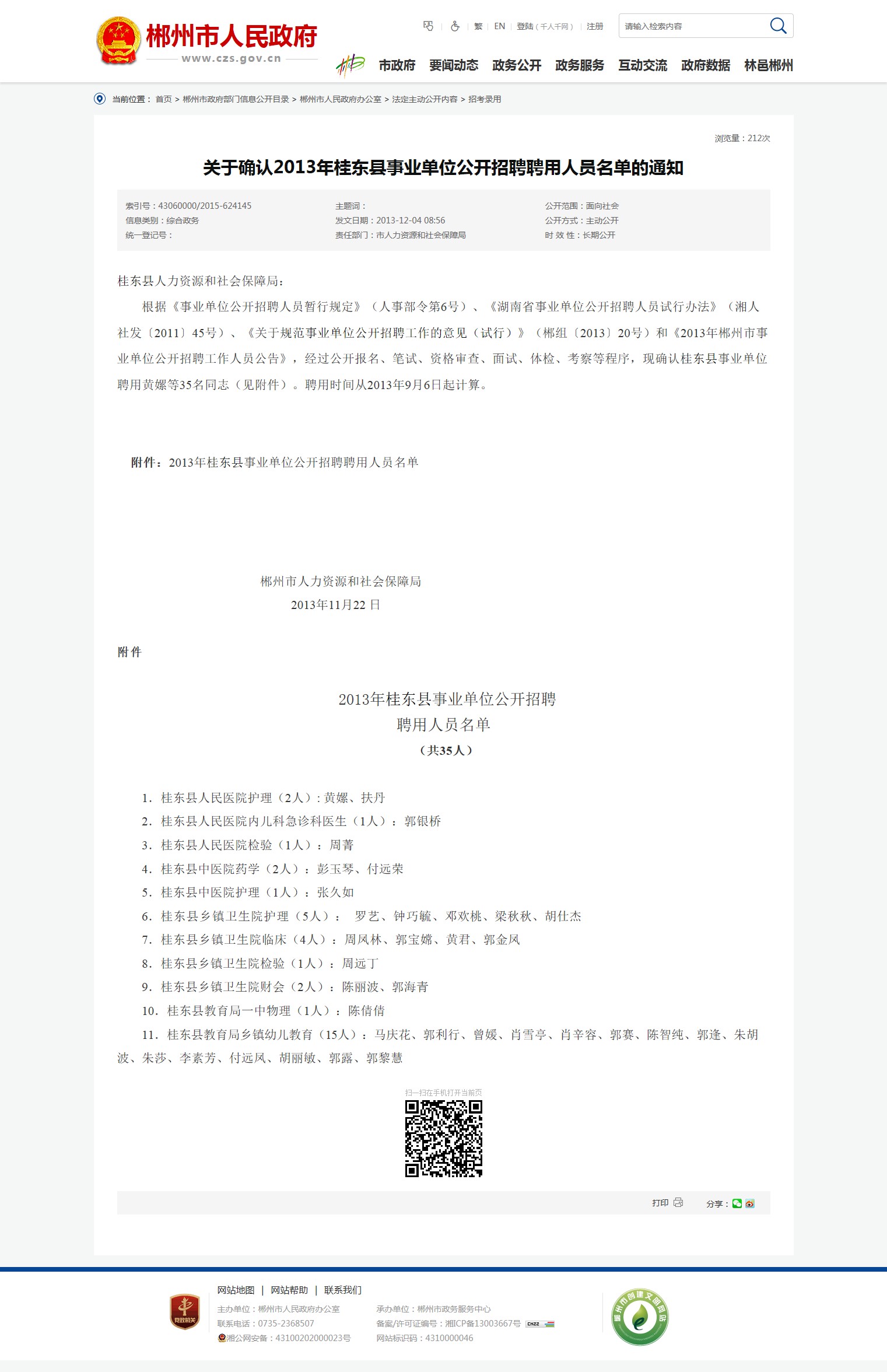 根据《事业单位公开招聘人员暂行规定》(人事部令第6号)、《湖南省事业单位公开招聘人员试行办法》(湘人社发〔2011〕45号)、《关于规范事业单位公开招聘工作的意见(试行)》(郴组〔2013〕20号)和《2013年郴州市事业单位公开招聘工作人员公告》,经过公开报名、笔试、资格审查、面试、体检、考察等程序,现确认桂东县事业单位聘用黄嫘等35名同志(见附件)。聘用时间从2013年9月6日起计算。