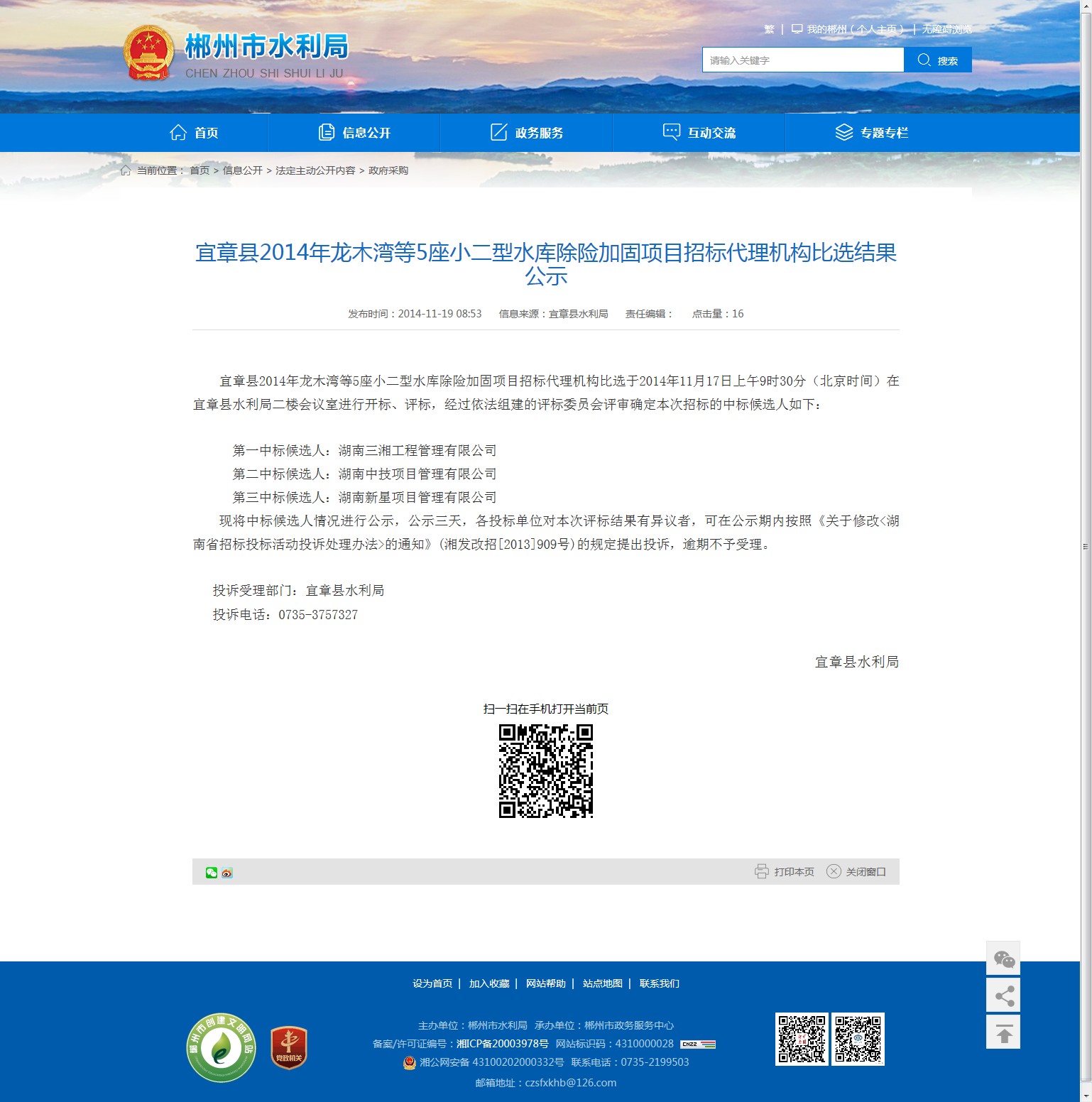 投诉受理部门:宜章县水利局