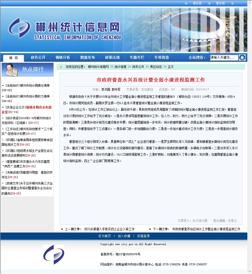 根据市政府《关于开展2015年全市统计工作暨全面小康进程监测工作督查的通知》(郴政办函〔2015〕118号)文件精神,8月14日,市统计局党组成员、副局长罗玉辉一行6人赴永兴县督查统计暨全面小康进程监测工作。