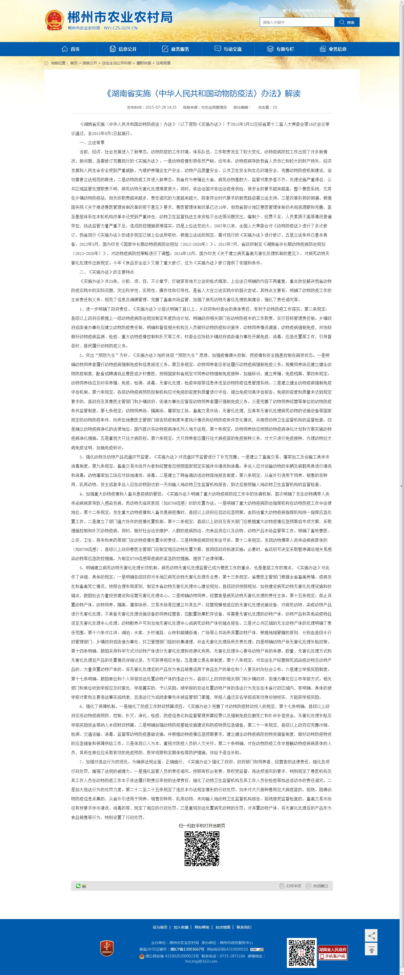 《湖南省实施〈中华人民共和国动物防疫法〉办法》(以下简称《实施办法》)于2015年5月22日经省第十二届人大常委会第16次会议审议通过,自2015年8月1日起施行。