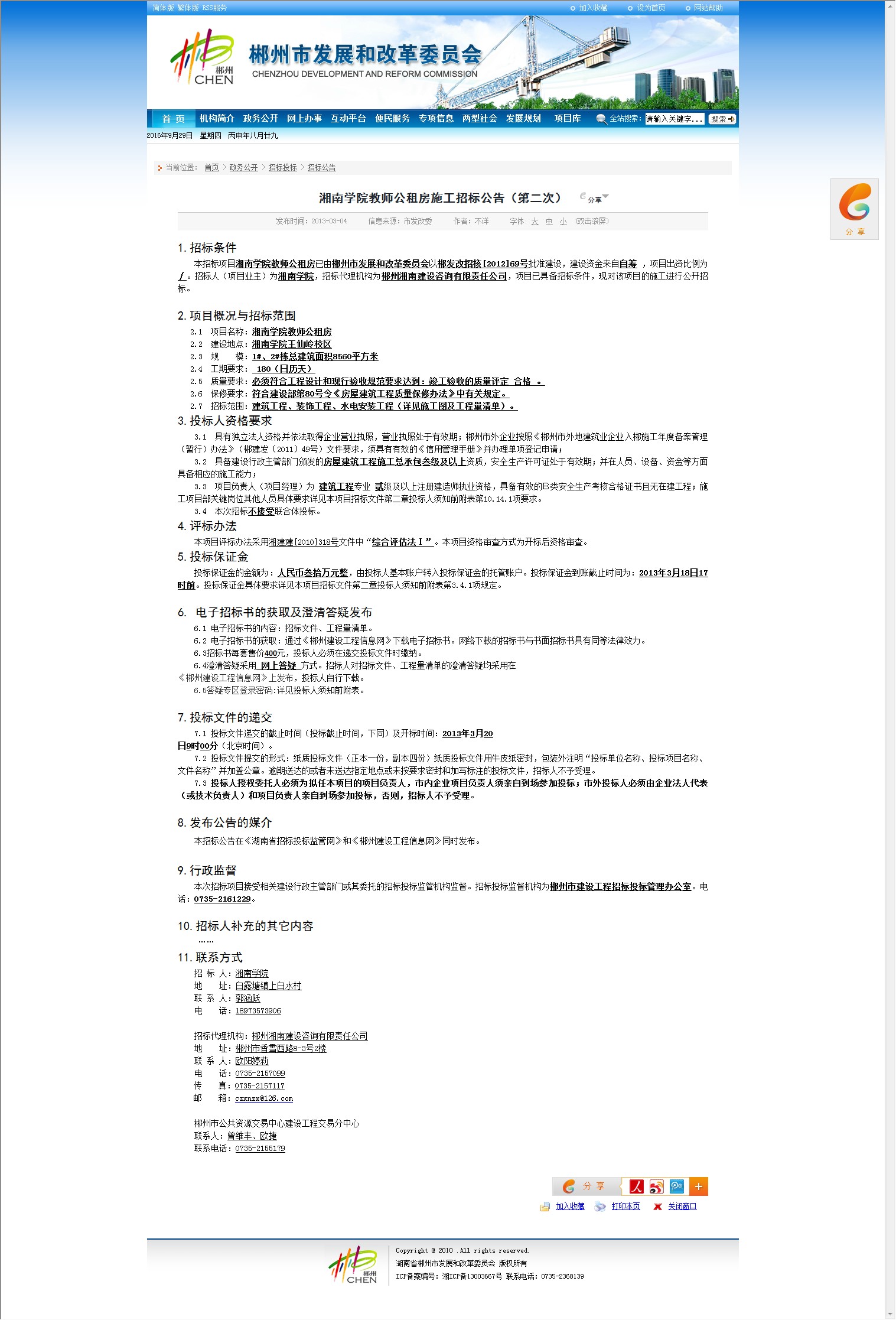 本招标公告在《湖南省招标投标监管网》和《郴州建设工程信息网》同时发布。