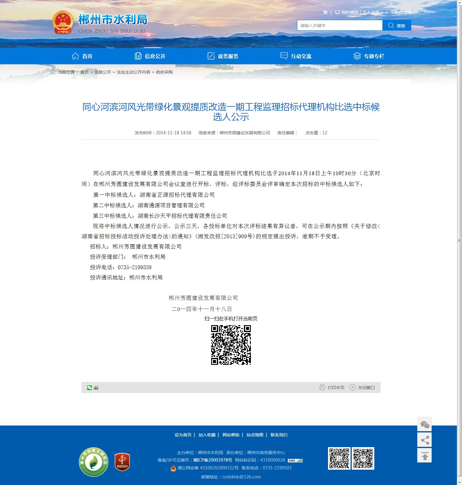 投诉受理部门: 郴州市水利局