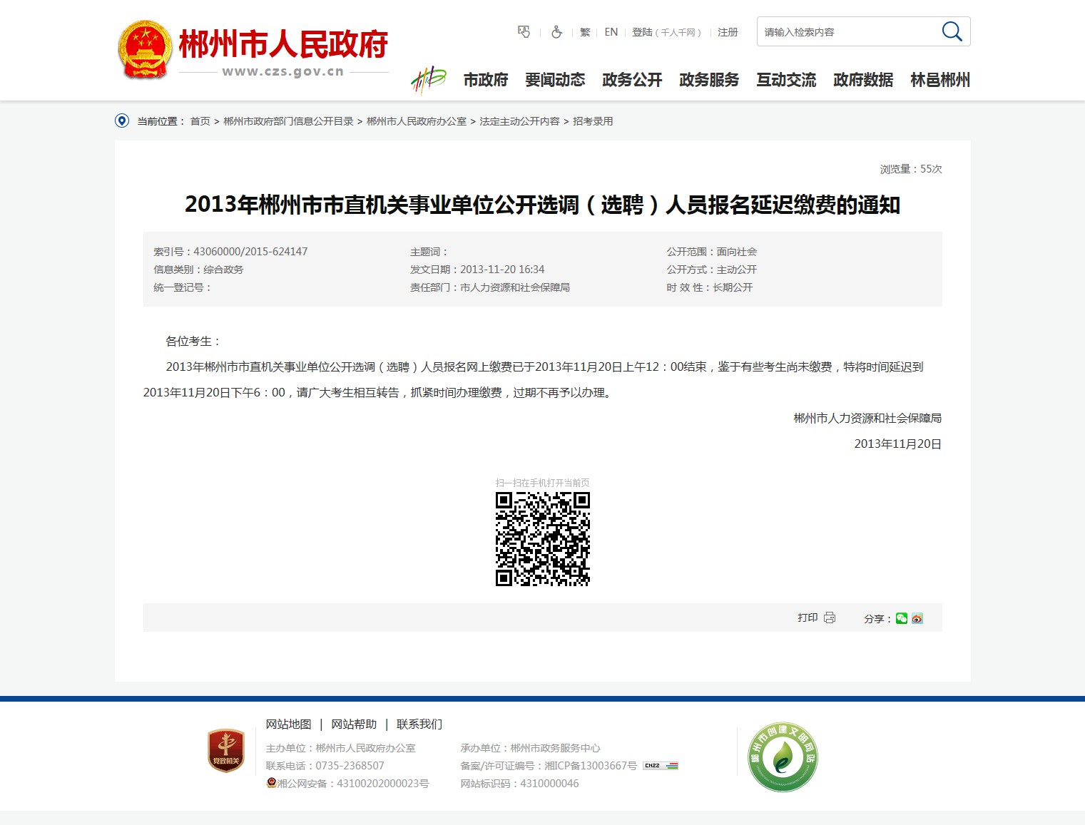 2013年郴州市市直机关事业单位公开选调(选聘)人员报名网上缴费已于2013年11月20日上午12:00结束,鉴于有些考生尚未缴费,特将时间延迟到2013年11月20日下午6:00,请广大考生相互转告,抓紧时间办理缴费,过期不再予以办理。