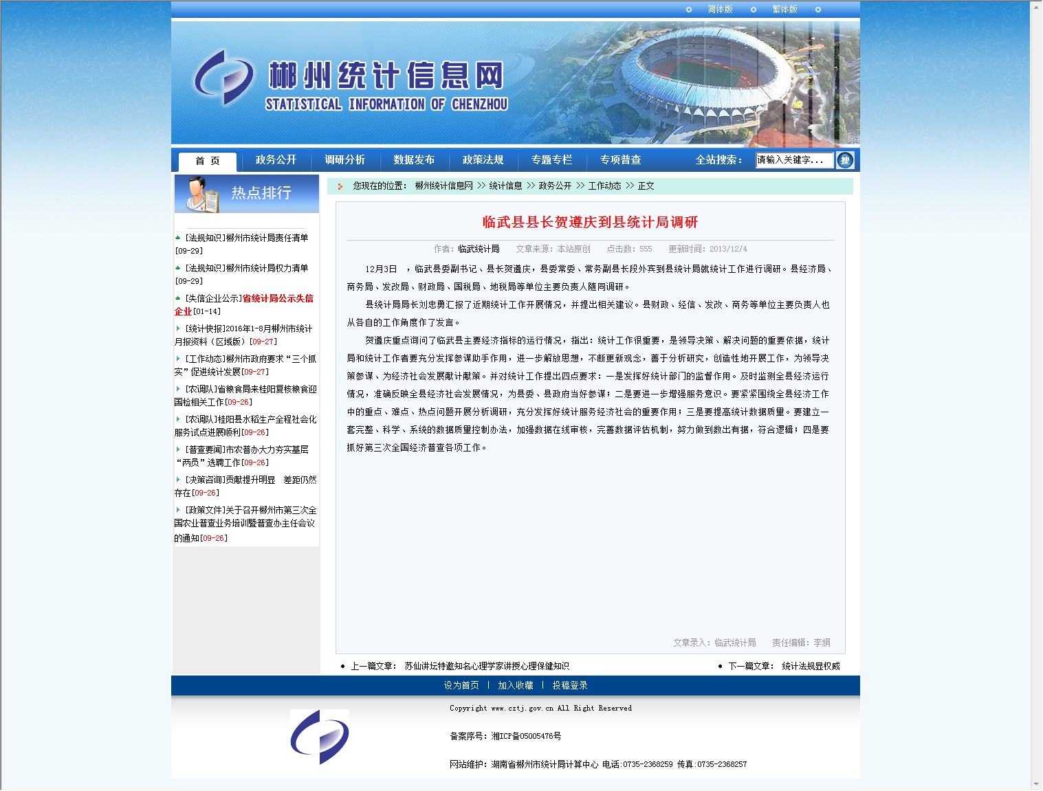 12月3日 ,临武县委副书记、县长贺遵庆,县委常委、常务副县长段外宾到县统计局就统计工作进行调研。县经济局、商务局、发改局、财政局、国税局、地税局等单位主要负责人随同调研。