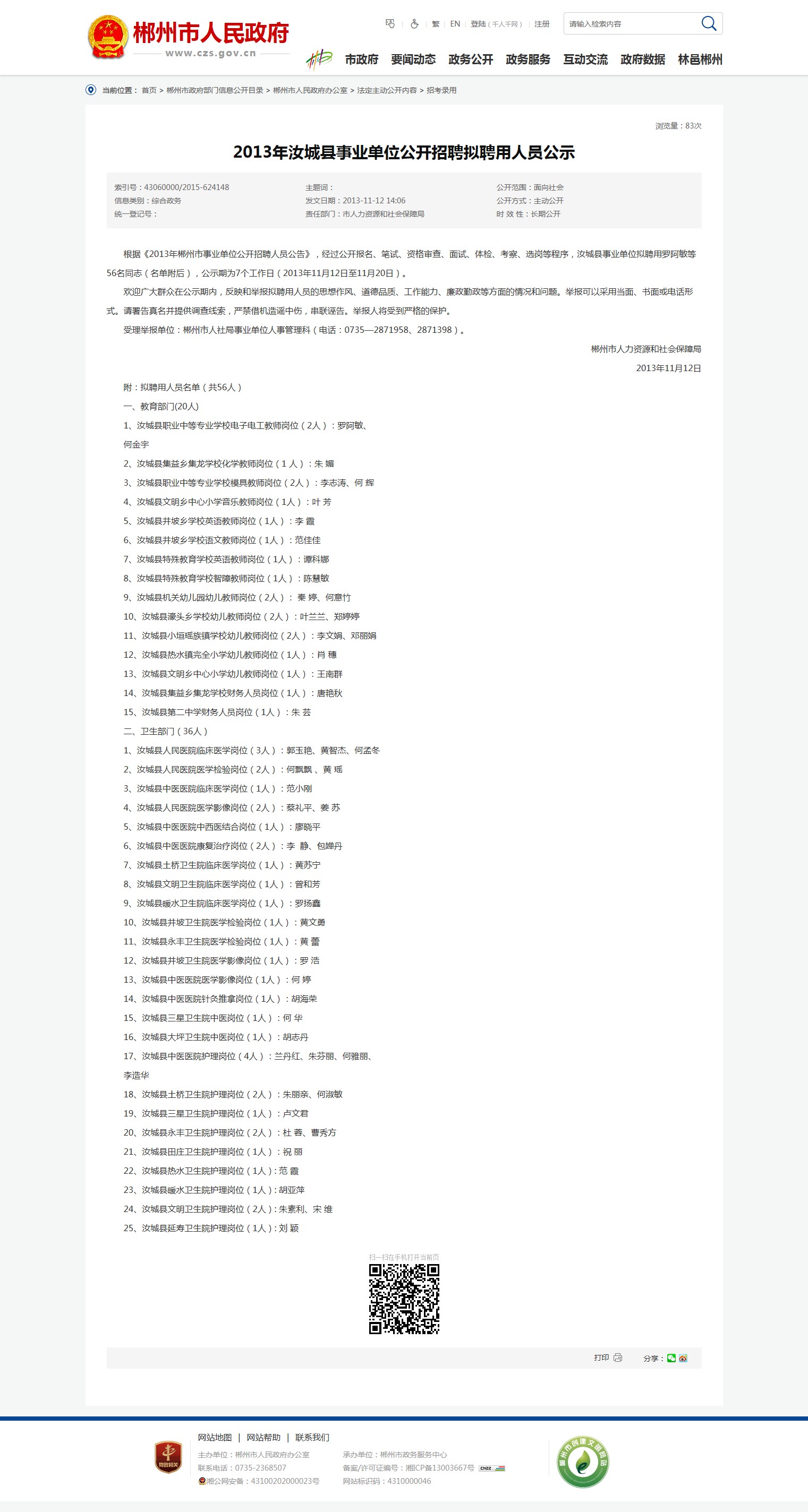 根据《2013年郴州市事业单位公开招聘人员公告》,经过公开报名、笔试、资格审查、面试、体检、考察、选岗等程序,汝城县事业单位拟聘用罗阿敏等56名同志(名单附后),公示期为7个工作日(2013年11月12日至11月20日)。