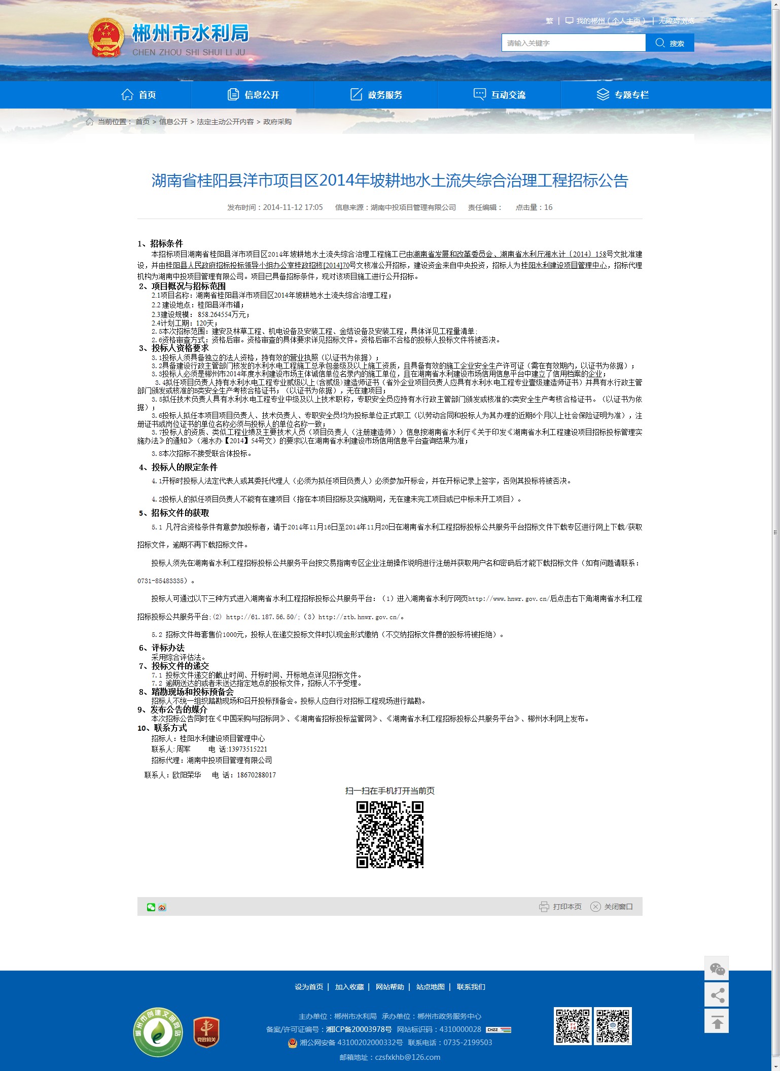 本次招标公告同时在《中国采购与招标网》、《湖南省招标投标监管网》、《湖南省水利工程招标投标公共服务平台》、郴州水利网上发布。