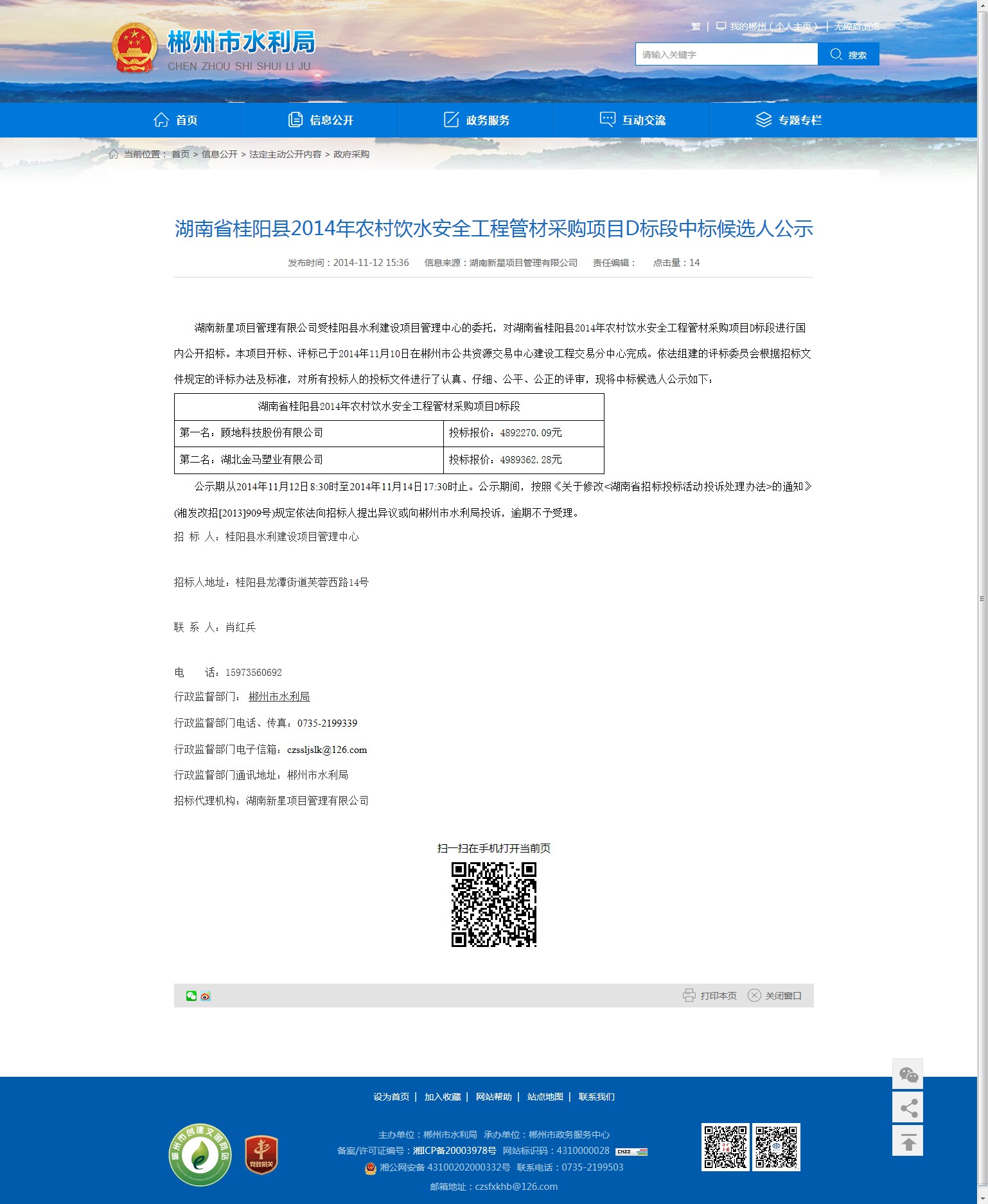 公示期从2014年11月12日8:30时至2014年11月14日17:30时止。公示期间,按照《关于修改<湖南省招标投标活动投诉处理办法>的通知》(湘发改招[2013]909号)规定依法向招标人提出异议或向郴州市水利局投诉,逾期不予受理。