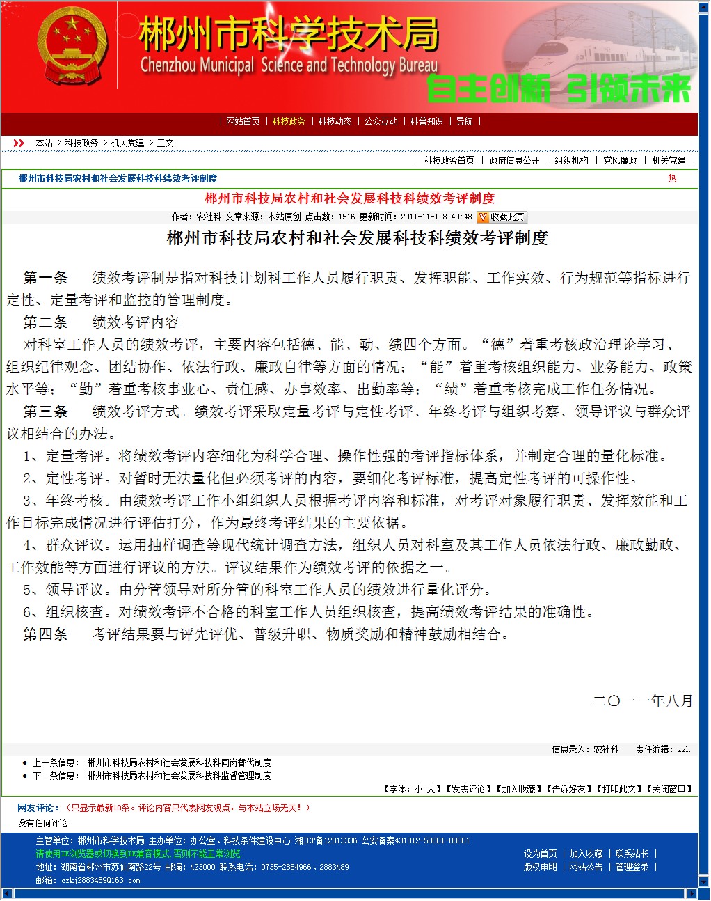 郴州市科技局农村和社会发展科技科绩效考评制度