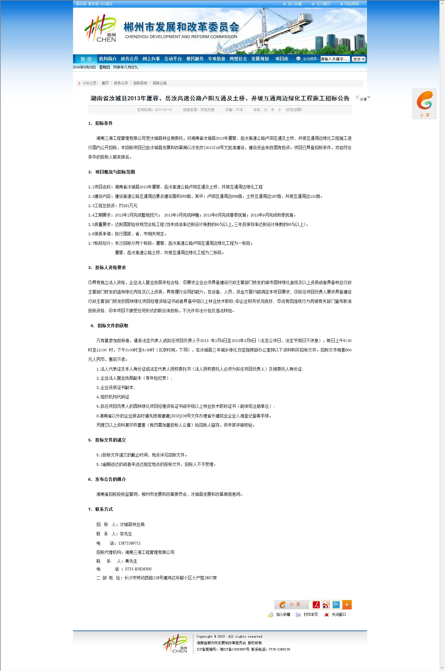 湖南省招标投标监管网、郴州市发展和改革委员会、汝城县发展和改革局信息网。