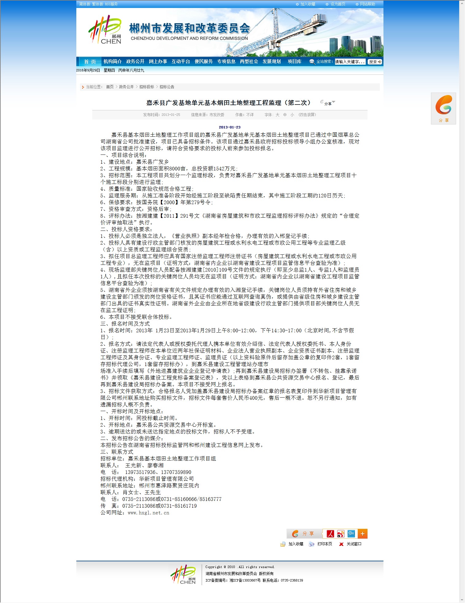 嘉禾县基本烟田土地整理工作项目组的嘉禾县广发基地单元基本烟田土地整理项目已通过中国烟草总公司湖南省公司批准建设,项目已具备招标条件。该项目通过嘉禾县政府招标投标领导小组办公室核准,现对该项目监理进行公开招标,请符合资格要求的投标人前来参加投标报名。 一、项目综合说明: 1、建设地点:嘉禾县广发乡 2、工程规模:基本烟田面积8000亩,总投资额1542万元; 3、招标范围:本工程项目共划分一个监理标段,负责对嘉禾县广发基地单元基本烟田土地整理工程项目十个施工标段分别进行监理; 4、质量标准:国家验收规范合格工程; 5、监理服务期:从施工准备阶段开始经施工阶段至缺陷责任期结束,其中施工阶段工期约120日历天; 6、保修要求:按国务院【2000】年第279号令; 7、资格审查方式:资格后审; 8、评标办法:按湘建建【2011】291号文《湖南省房屋建筑和市政工程监理招标评标办法》规定的“合理定价评审抽取法”执行。 二、投标人资格要求: 1、投标人必须是独立法人,《营业执照》副本经年检合格,办理有效的入郴登记手续; 2、投标人具有建设行政主管部门核发的房屋建筑工程或水利水电工程或市政公用工程等专业监理乙级(含)以上资质或工程监理综合资质; 3、拟任项目总监理工程师应具有国家注册监理工程师注册证书(房屋建筑工程或水利水电工程或市政公用工程专业),无在监项目(证明方式:湖南省内企业以湖南省建设工程项目监管信息平台查验为准); 4、现场监理部关键岗位人员配备按湘建建[2010]109号文件的规定执行(即至少总监1人、专监1人和监理员1人),且拟任本次投标的关键岗位人员均无在监项目(证明方式:湖南省内企业以湖南省建设工程项目监管信息平台查验为准); 5、湖南省外企业须按湖南省有关文件规定办理有效的入湘登记手续,关键岗位人员须持有外省住房和城乡建设主管部门颁发的岗位资格证书,且其证书应能通过互联网查询真伪,或提供由省级住房和城乡建设主管部门出具的证书真实性证明。湖南省外企业由企业所在地省级建设行政主管部门提供项目部关键岗位人员无在监工程证明; 6、本项目不接受联合体投标。 三、报名时间及方式 1、报名时间:2013年 1月23日至2013年1月29日上午8:00-12:00,下午14:30-17:00(北京时间,不含节假日); 2、报名方式:请法定代表人或授权委托代理人携本单位有效介绍信、法定代表人授权委托书、本人身份证、注册监理工程师在本单位近两年社保证明材料、企业法人营业执照副本、企业资质证书副本、注册监理工程师证及其身份证、专业监理工程师证、监理员证(以上资料验原件后留存加盖公章的复印件2套,1套留存招标代理公司,1套留存招标办),到嘉禾县建设工程管理站办理市 场准入手续后填写《外地进嘉建筑业企业登记申请表》;再到嘉禾县建设局招标办签署《不转包、挂靠承诺书》并领取《嘉禾县建设工程竞标备案登记表》,凭以上表格到嘉禾县公共资源交易中心报名、登记,最后再到嘉禾县建设局招标办备案。本项目不接受网上报名。 3、招标文件获取方式:合格报名人凭加盖嘉禾县建设局招标办备案红章的报名表复印件到华新项目管理有限公司郴州联系地址购买招标文件,招标文件每套售价人民币400元,售后一概不退。恕不另行通知,如有遗漏招标人概不负责。 一、开标时间及开标地点: 1、开标时间:同投标截止时间。 2、开标地点:嘉禾县公共资源交易中心开标室。 3、逾期送达的或未送达指定地点的投标文件,招标人不予受理。 二、发布招标公告的媒介: 本招标公告在湖南省招标投标监管网和郴州建设工程信息网上发布。 三、联系方式 招标单位:嘉禾县基本烟田土地整理工作项目组 联系人: 王光新、廖春湘 电 话: 13973517936、13707359890 招标代理机构:华新项目管理有限公司 郴州联系地址:郴州市惠泽路聚贤庄院内 联系人:肖女士、王先生 电 话:0735-2113086或0731-85160666/85163777 传 真:0735-2113086或0731-85161719 公司网址:www.hxgl.net.cn |