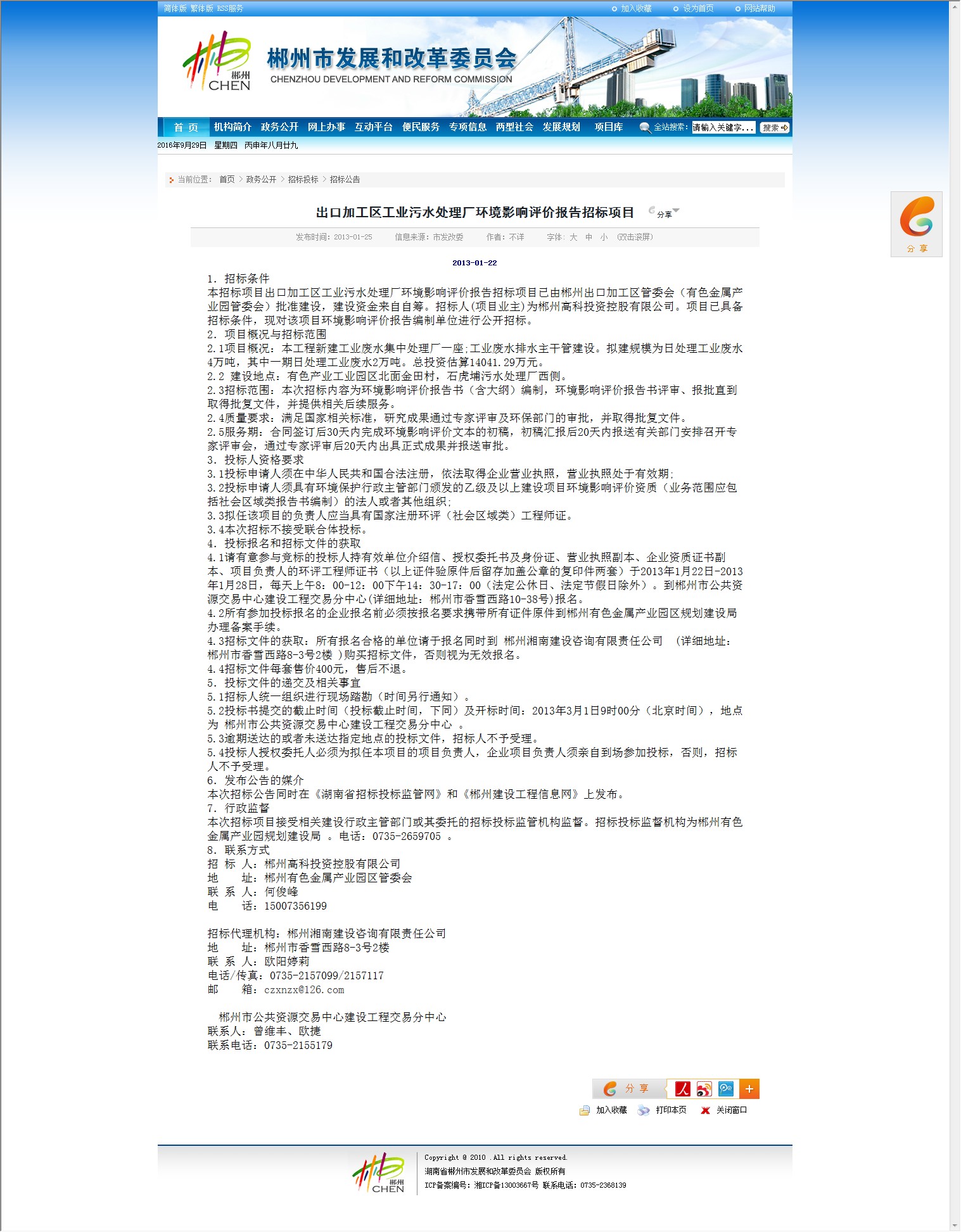 1.招标条件 本招标项目出口加工区工业污水处理厂环境影响评价报告招标项目已由郴州出口加工区管委会(有色金属产业园管委会)批准建设,建设资金来自自筹。招标人(项目业主)为郴州高科投资控股有限公司。项目已具备招标条件,现对该项目环境影响评价报告编制单位进行公开招标。 2.项目概况与招标范围 2.1项目概况:本工程新建工业废水集中处理厂一座;工业废水排水主干管建设。拟建规模为日处理工业废水4万吨,其中一期日处理工业废水2万吨。总投资估算14041.29万元。 2.2 建设地点:有色产业工业园区北面金田村,石虎埔污水处理厂西侧。 2.3招标范围:本次招标内容为环境影响评价报告书(含大纲)编制,环境影响评价报告书评审、报批直到取得批复文件,并提供相关后续服务。 2.4质量要求:满足国家相关标准,研究成果通过专家评审及环保部门的审批,并取得批复文件。 2.5服务期:合同签订后30天内完成环境影响评价文本的初稿,初稿汇报后20天内报送有关部门安排召开专家评审会,通过专家评审后20天内出具正式成果并报送审批。 3.投标人资格要求 3.1投标申请人须在中华人民共和国合法注册,依法取得企业营业执照,营业执照处于有效期; 3.2投标申请人须具有环境保护行政主管部门颁发的乙级及以上建设项目环境影响评价资质(业务范围应包括社会区域类报告书编制)的法人或者其他组织; 3.3拟任该项目的负责人应当具有国家注册环评(社会区域类)工程师证。 3.4本次招标不接受联合体投标。 4.投标报名和招标文件的获取 4.1请有意参与竞标的投标人持有效单位介绍信、授权委托书及身份证、营业执照副本、企业资质证书副本、项目负责人的环评工程师证书(以上证件验原件后留存加盖公章的复印件两套)于2013年1月22日-2013年1月28日,每天上午8:00-12:00下午14:30-17:00(法定公休日、法定节假日除外)。到郴州市公共资源交易中心建设工程交易分中心(详细地址:郴州市香雪西路10-38号)报名。 4.2所有参加投标报名的企业报名前必须按报名要求携带所有证件原件到郴州有色金属产业园区规划建设局办理备案手续。 4.3招标文件的获取:所有报名合格的单位请于报名同时到 郴州湘南建设咨询有限责任公司 (详细地址:郴州市香雪西路8-3号2楼 )购买招标文件,否则视为无效报名。 4.4招标文件每套售价400元,售后不退。 5.投标文件的递交及相关事宜 5.1招标人统一组织进行现场踏勘(时间另行通知)。 5.2投标书提交的截止时间(投标截止时间,下同)及开标时间:2013年3月1日9时00分(北京时间),地点为 郴州市公共资源交易中心建设工程交易分中心 。 5.3逾期送达的或者未送达指定地点的投标文件,招标人不予受理。 5.4投标人授权委托人必须为拟任本项目的项目负责人,企业项目负责人须亲自到场参加投标,否则,招标人不予受理。 6.发布公告的媒介 本次招标公告同时在《湖南省招标投标监管网》和《郴州建设工程信息网》上发布。 7.行政监督 本次招标项目接受相关建设行政主管部门或其委托的招标投标监管机构监督。招标投标监督机构为郴州有色金属产业园规划建设局 。电话:0735-2659705 。 8.联系方式 招 标 人:郴州高科投资控股有限公司 地 址:郴州有色金属产业园区管委会 联 系 人:何俊峰 电 话:15007356199