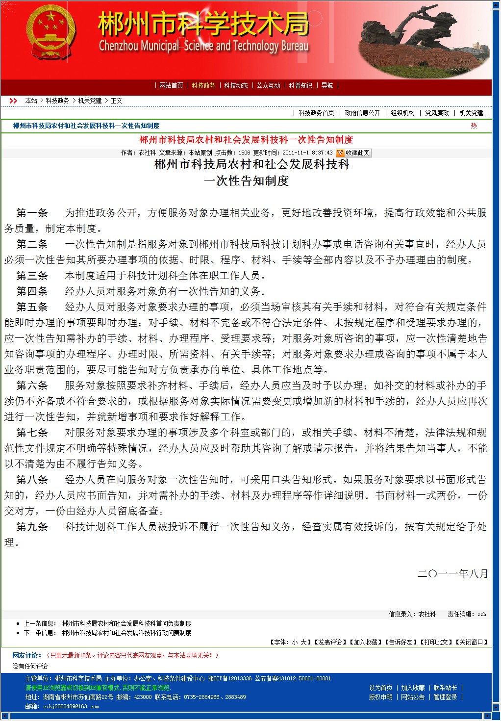 第二条 一次性告知制是指服务对象到郴州市科技局科技计划科办事或电话咨询有关事宜时,经办人员必须一次性告知其所要办理事项的依据、时限、程序、材料、手续等全部内容以及不予办理理由的制度。