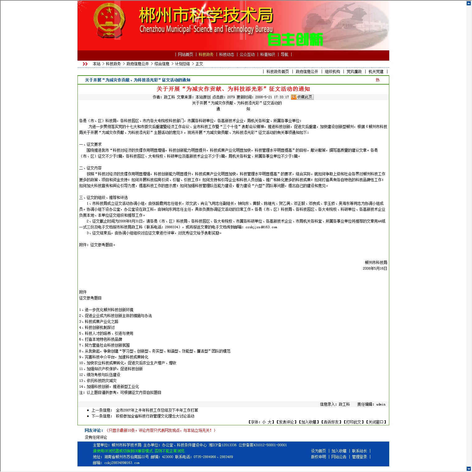 为进一步贯彻落实党的十七大和市委灾后重建暨经济工作会议、全市科技工作暨“三个十佳”表彰会议精神,推进科技创新,促进灾后重建,加快建设创新型郴州,根据《郴州市科技局关于开展“为减灾作贡献、为科技添光彩”主题活动的意见》,现将开展“为减灾做贡献、为科技添光彩”征文活动的有关事项通知如下: